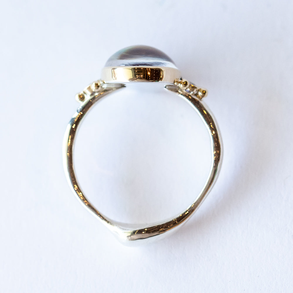 Shimmering like an oil slick in the best possible way, this oval abalone ring delivers major color-shifting magic. The iridescent abalone shell flashes in dreamy greens, blues, and purples—paired perfectly with two lilac tanzanites for a subtle hit of sparkle. It’s set in a 14k yellow gold bezel and anchored by Emily Amey’s signature sterling silver seagrass band for an earthy, organic touch.
