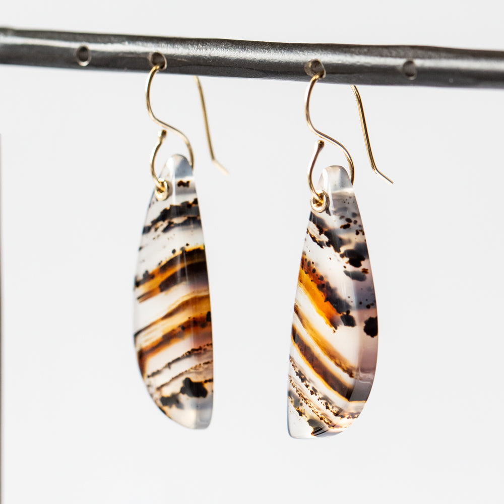 Asymmetrical smooth Montana agate drop earrings drilled and sleeved in 14k yellow gold on 14k yellow gold ear wires