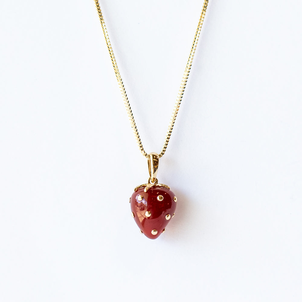 The cutest little fruit in your jewelry box. Ariel Gordon’s Petite Strawberry Charm is hand-carved from vibrant red agate and dotted with 14k gold seed details that catch the light just right.