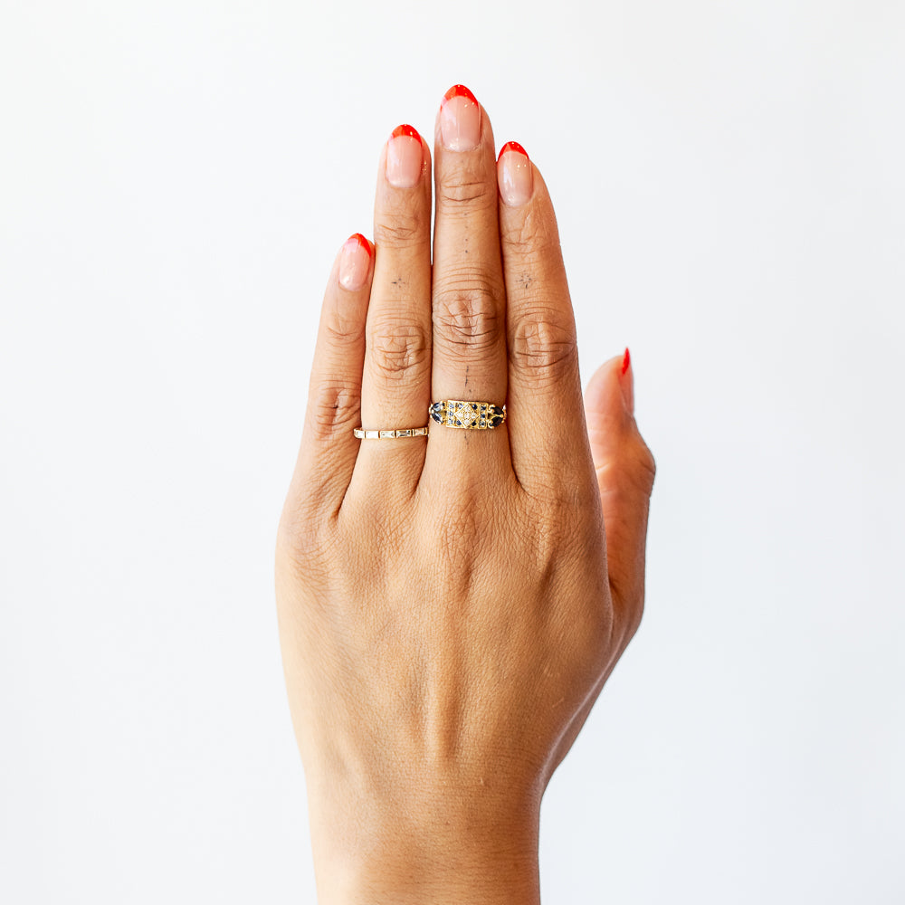 A gradient of dark to light blue sapphires, paired with the twinkle of salt and pepper diamonds, gives off vintage-inspired vibes in this timeless wide gemstone ring. The setting nods to heirloom styles, but the color play and low-profile design keep it feeling modern and totally wearable. Wear it with jeans and a tee or a flowy dress and strappy sandals—this is the ring that goes with everything.