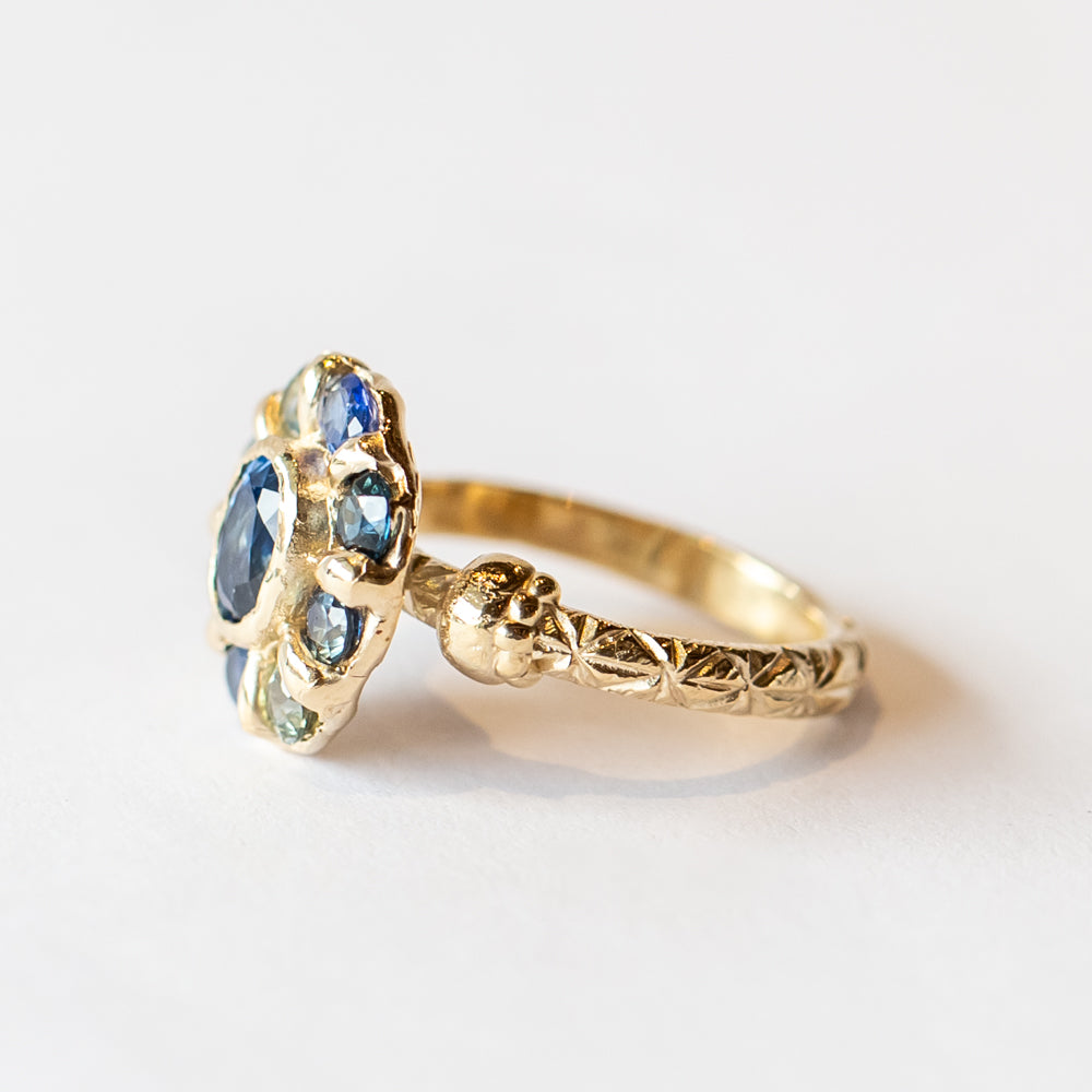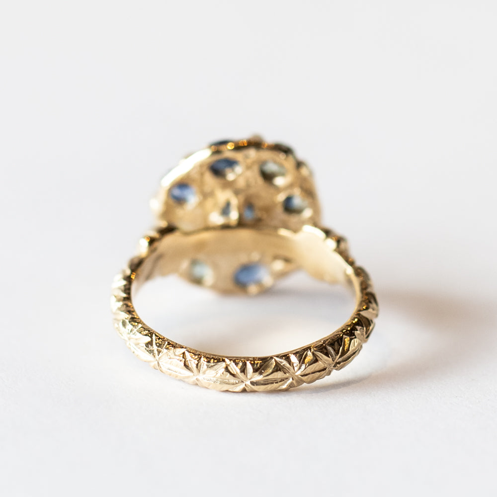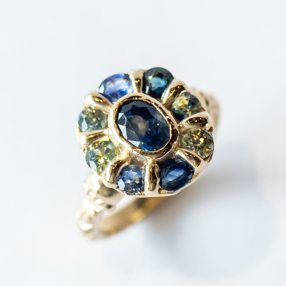 2.6ctw colored sapphires are arranged in a 9k yellow gold organic ring setting.