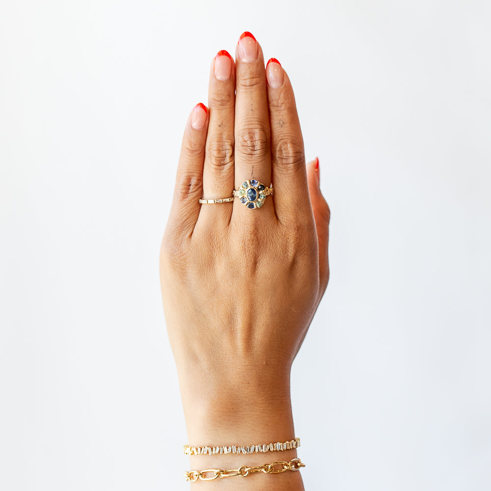 Bold, vibrant, and totally captivating—Ciara Bowles’ Blue and Green Sapphire Mega Halo Ring is a statement piece like no other. At its heart sits a striking deep teal blue oval sapphire, its deep, mesmerizing hue surrounded by an extra-large halo of multicolor sapphires in varying shades of blue and green. The contrast between the rich gemstones and soft yellow gold creates a breathtaking display of color and light. The band is engraved with intricate, textured details, adding a layer of sophistication and artistry that perfectly complements the ring’s vibrant design. For those who want a show-stopping, unforgettable piece, this ring is as unique and bold as it gets.