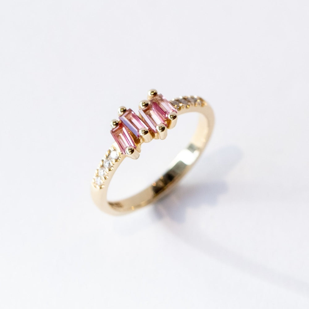 Four baguette cut pink topaz and white diamonds