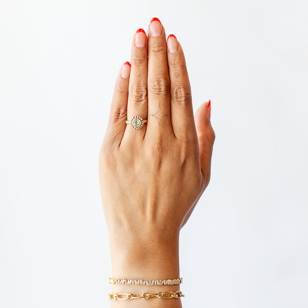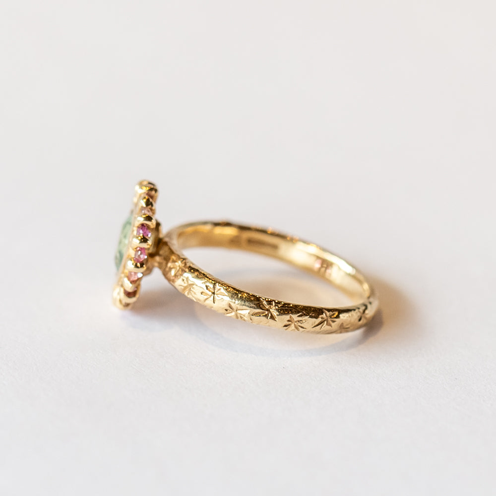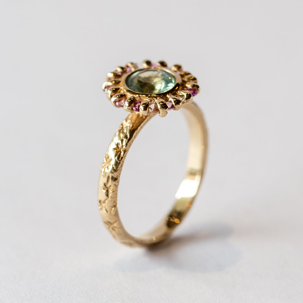 A splash of color and a whole lot of sparkle—Ciara Bowles' Sapphire Confetti Halo Ring is as fun as it is luxe. At the heart of the design is a sea green round Montana sapphire, its calming hue perfectly framed by a halo of vibrant pink sapphires, adding a lively pop of color. With a total of 1.6tcw, this ring delivers maximum impact with its playful combination of stones. The textured 9k yellow gold band adds a touch of artisanal charm, giving the piece a unique, handcrafted feel. Whether you're looking to elevate your everyday look or add a pop of color to something special, this ring brings the perfect balance of elegance and whimsy.