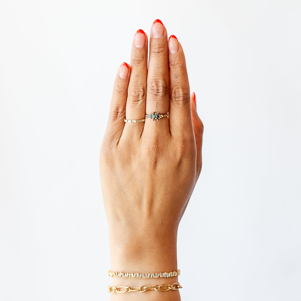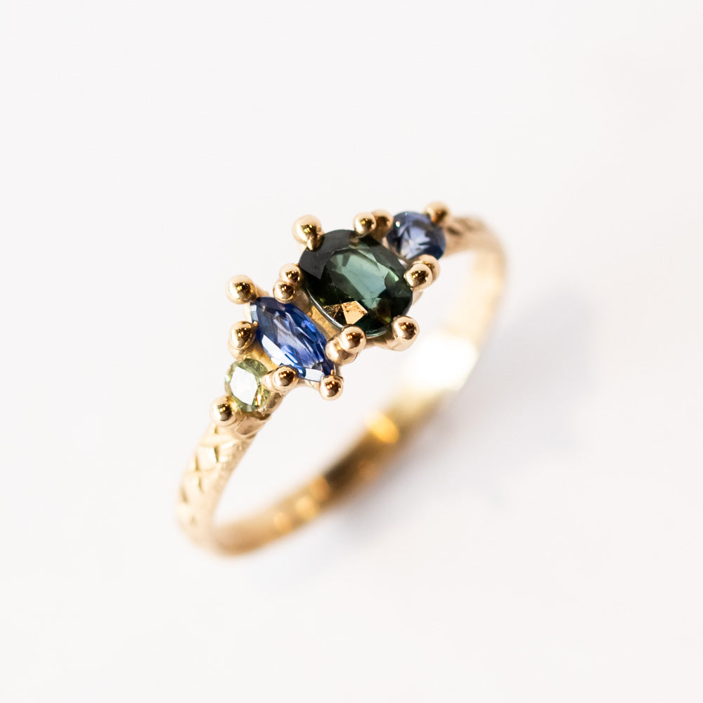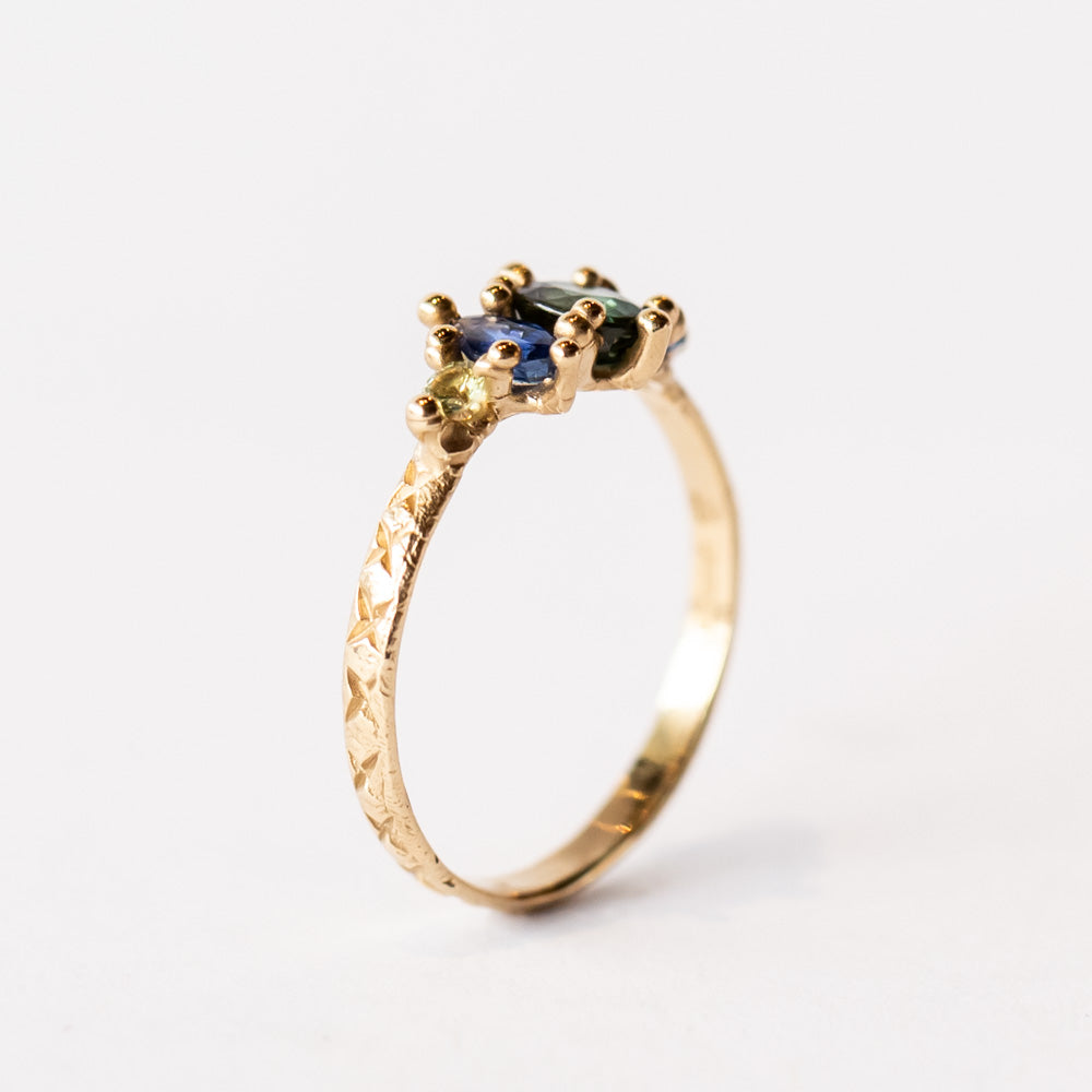 Add a splash of cool color with this vibrant harlequin ring, featuring a mix of blue and green sapphires prong-set in 9k yellow gold. The sapphires are arranged horizontally in different shapes, creating a dynamic, modern design that’s full of life. The textured gold band gives it an extra edge, combining playful with sophisticated. Blue and green sapphires not only bring a burst of color but are also known for their calming and healing properties—so you’re getting a beauty that’s both stylish and full of positive vibes. Wear it on its own for a bold statement, or stack it for a more layered, personalized look.