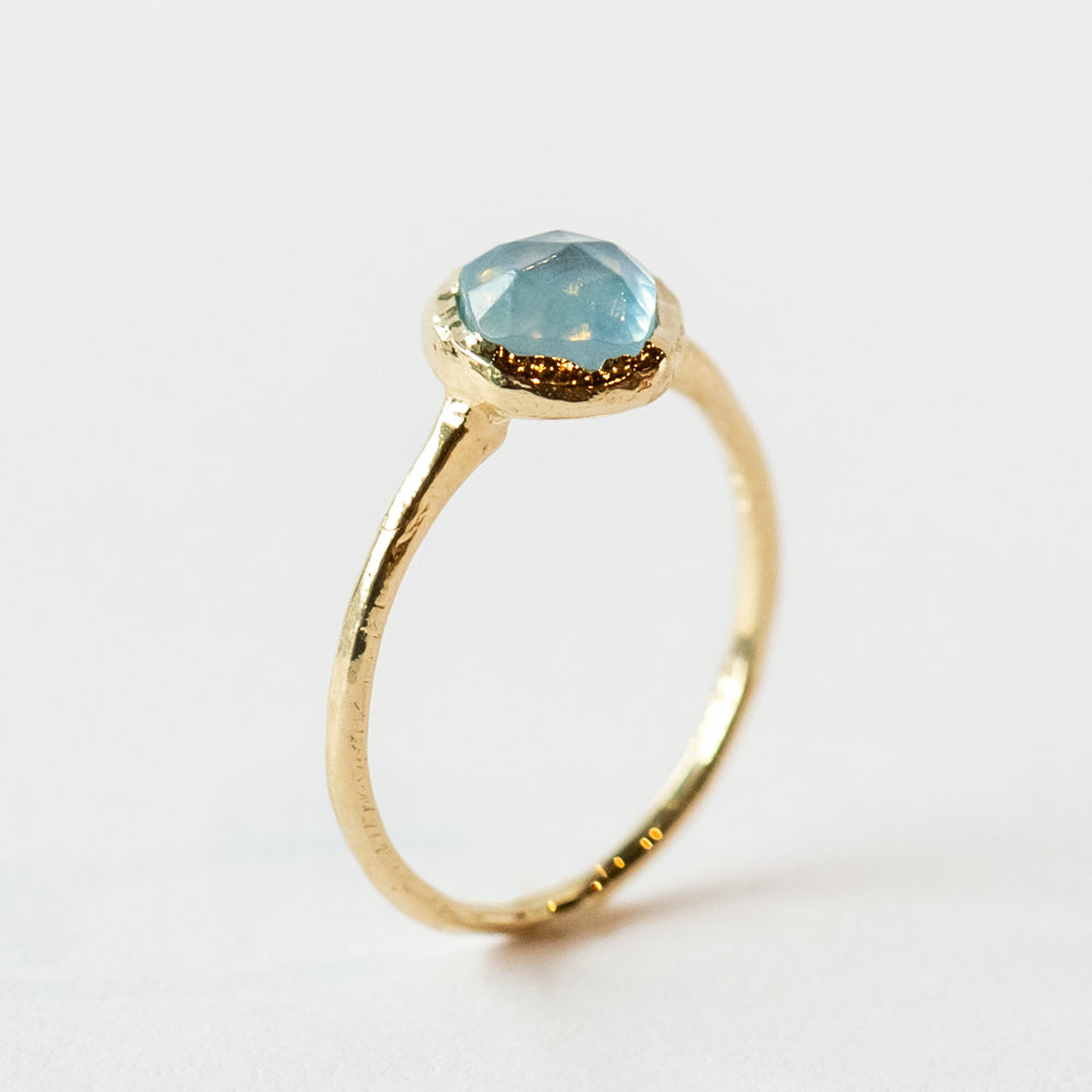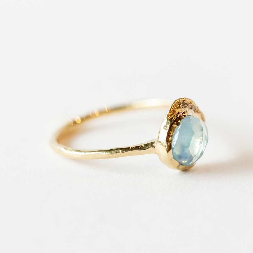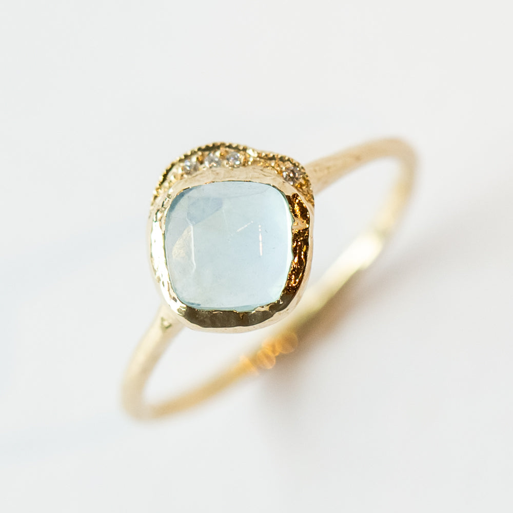 Inspired by the full moon reflecting off the waters of a beach cove hideaway, this Aquamarine finds a peaceful home surrounded by hand-sculpted gold and a twinkling strip of pavé-set diamonds.