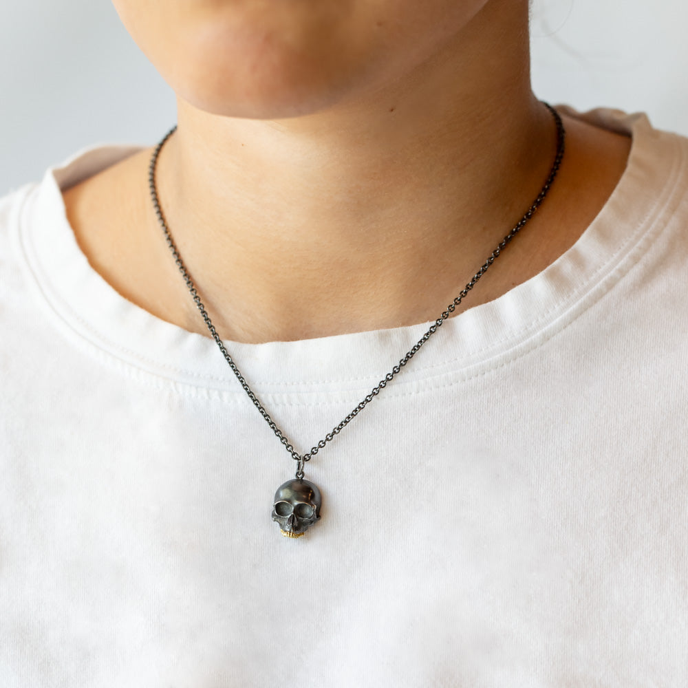 Make a statement with this blackened silver skull pendant necklace from designer Anthony Lent. It features a mostly symmetrical skull-ideal that beguiles your expectations by appearing perfect but possessing just enough subtle asymmetry to preserve a touch of the real.