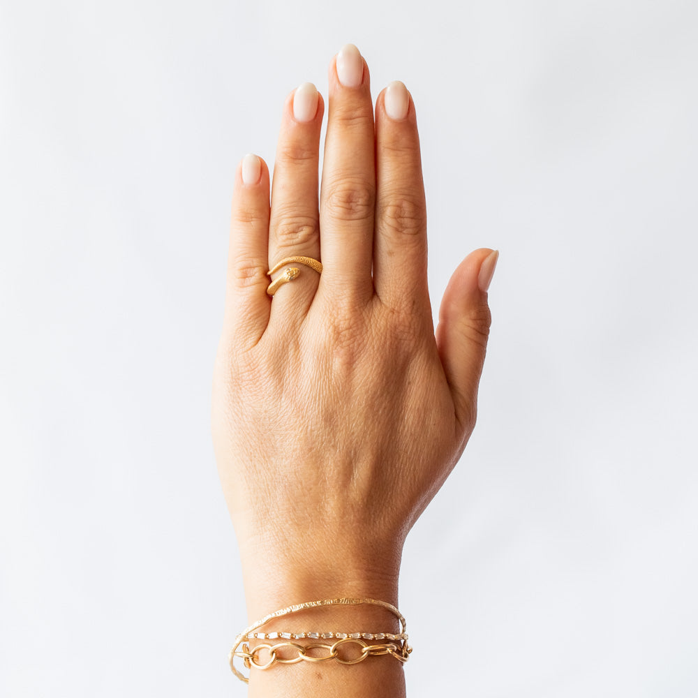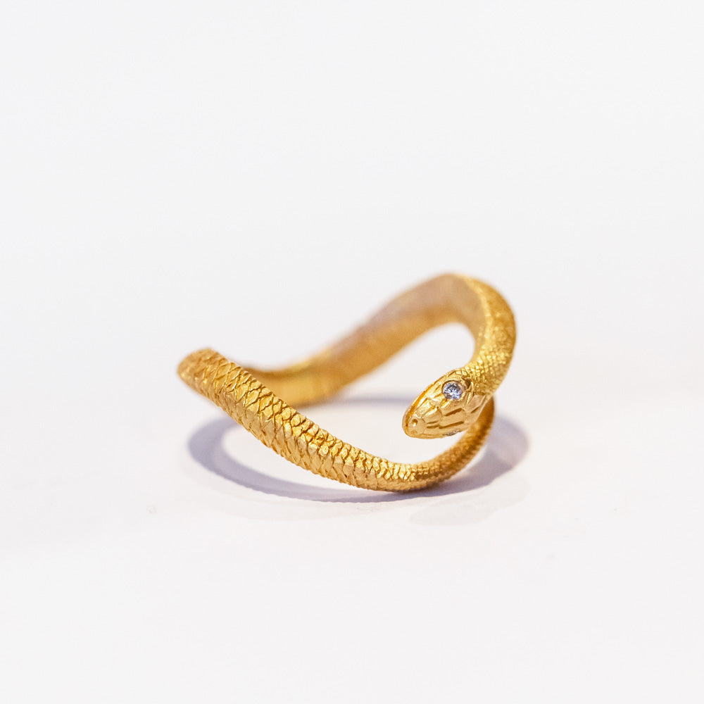 Designer Anthony Lent grew up marveling at rattlesnakes and how they often evoke strong polarizing emotions. On the one hand, snakes represent Biblical personifications of evil, and on the other they symbolize health and healing. Where is the compromise between the disguise of Satan and the staff of Asclepius? Can wearing a piece of jewelry help you confront your fears? This intricately detailed snake ring features a textured matte finish and inset diamond eyes.