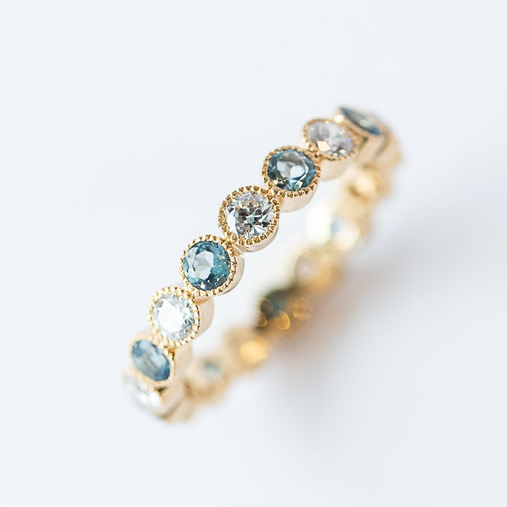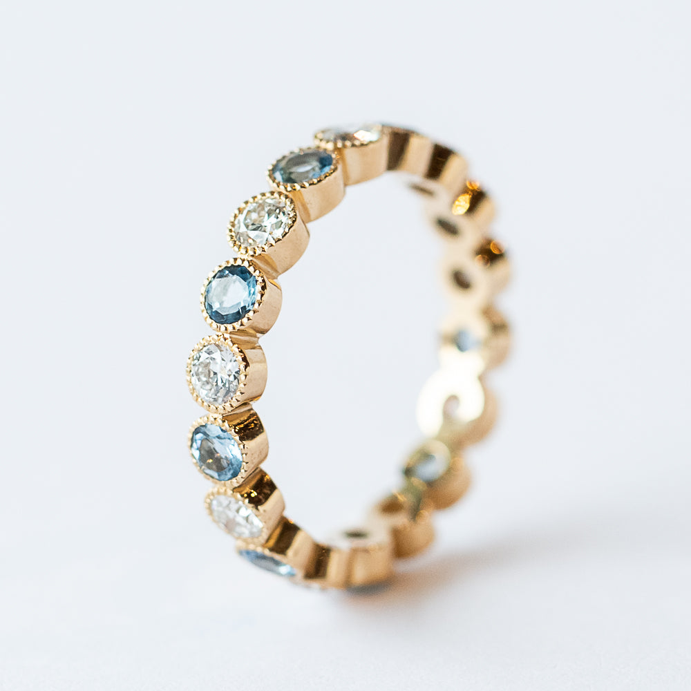 We're all drooling over this stunning rendition of Single Stone's signature Gabby eternity band. Handcrafted in rich 18k yellow gold, this one is set with alternating diamonds and aquamarines, giving you that little something blue. Whether you're wearing it solo or stacking it with other rings from your collection, the Gabby is gorgeous and won't let you down.