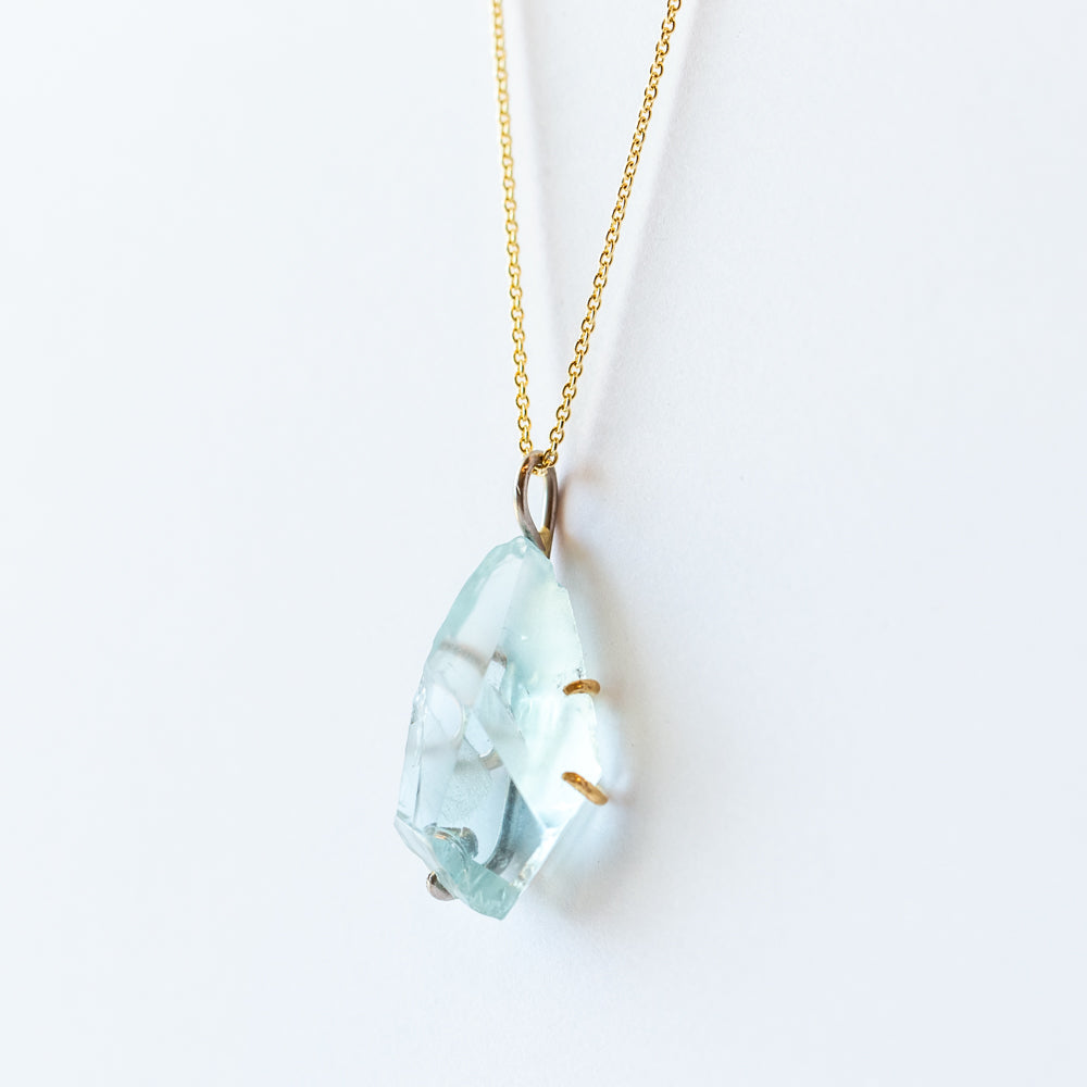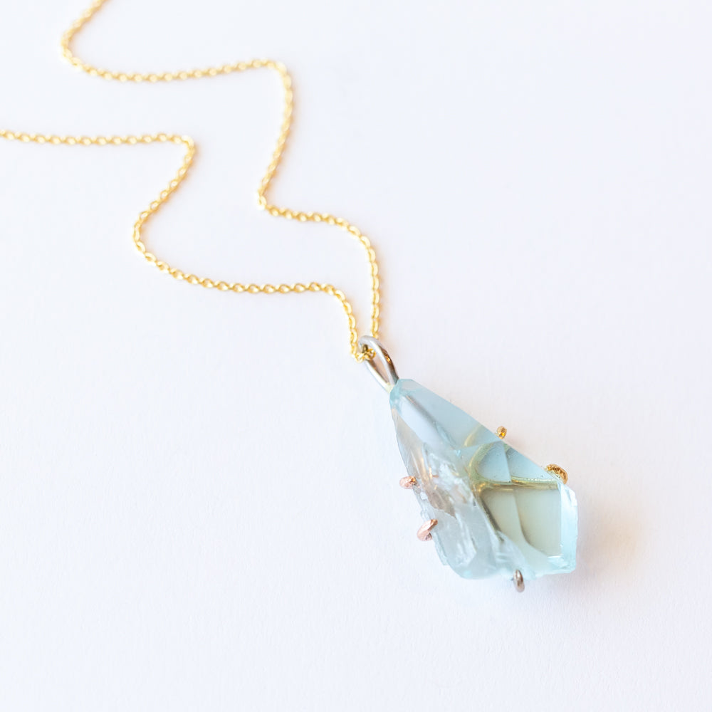Calling all water signs. This striking, rough-faceted aquamarine pendant is the luminous, natural addition your jewelry collection needs. The large gemstone is prong-set in Variance Objects’ signature blend of 14k–18k yellow, white, and rose gold. The mixed-metal prongs feel organic and sculptural, like gold was poured around the gem mid-magic spell.