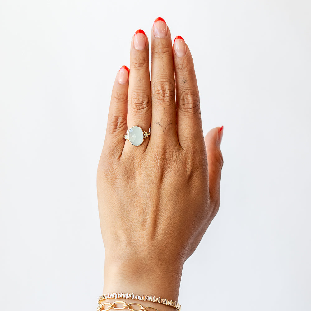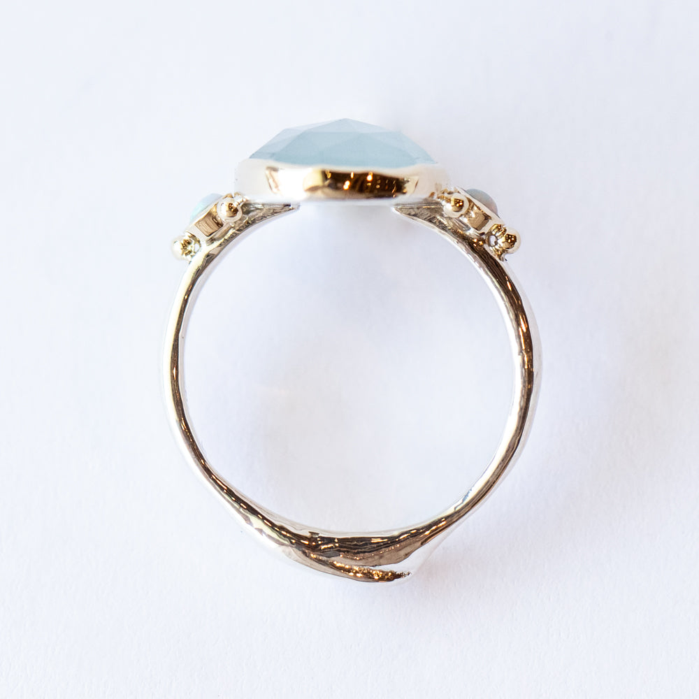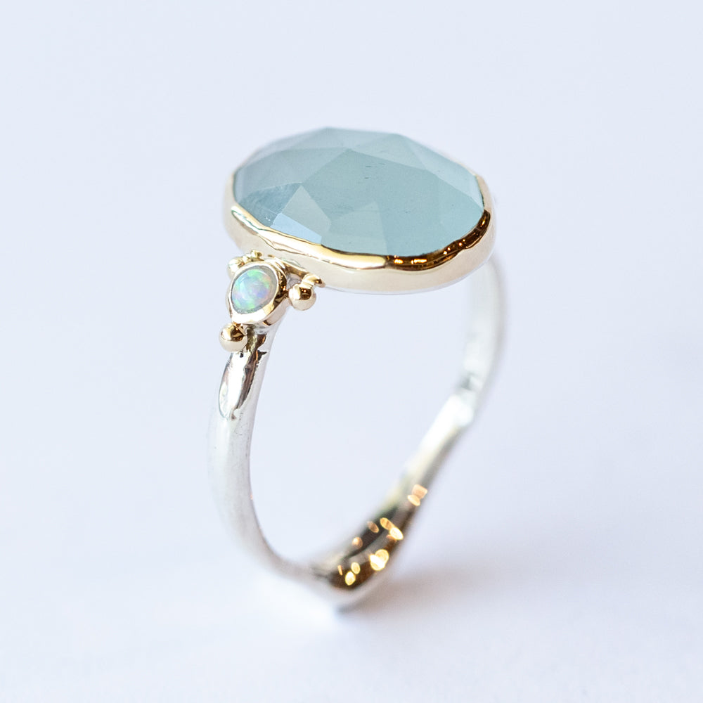 We love the super chill vibes of this aquamarine cocktail ring from Emily Amey. The March birthstone brings calm and cool confidence. The large, rose cut gemstone is accented on either side by petite Australian opals that lend the stone just enough fire for everyone to do a double-take.
