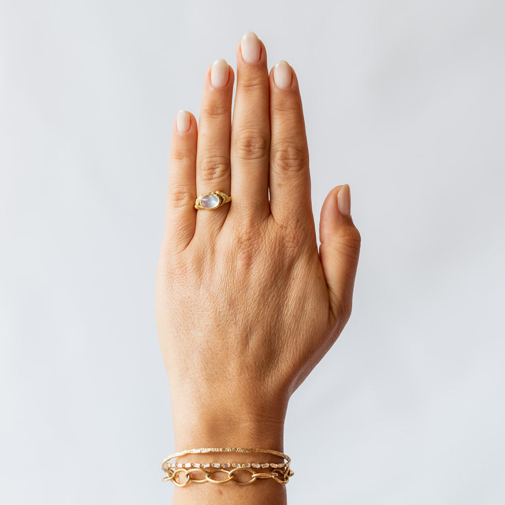 There is undoubtedly something fascinating about creatures that we seem to be hard-wired to be afraid of. The snake, in particular, evokes strong emotions in people. In this Anthony Lent snake ring, you'll find a double-headed creature wrapping its intricately textured form around your finger to embrace a glowing cabochon moonstone. Each serpent head features a tiny white diamond eye.