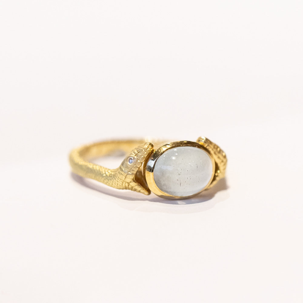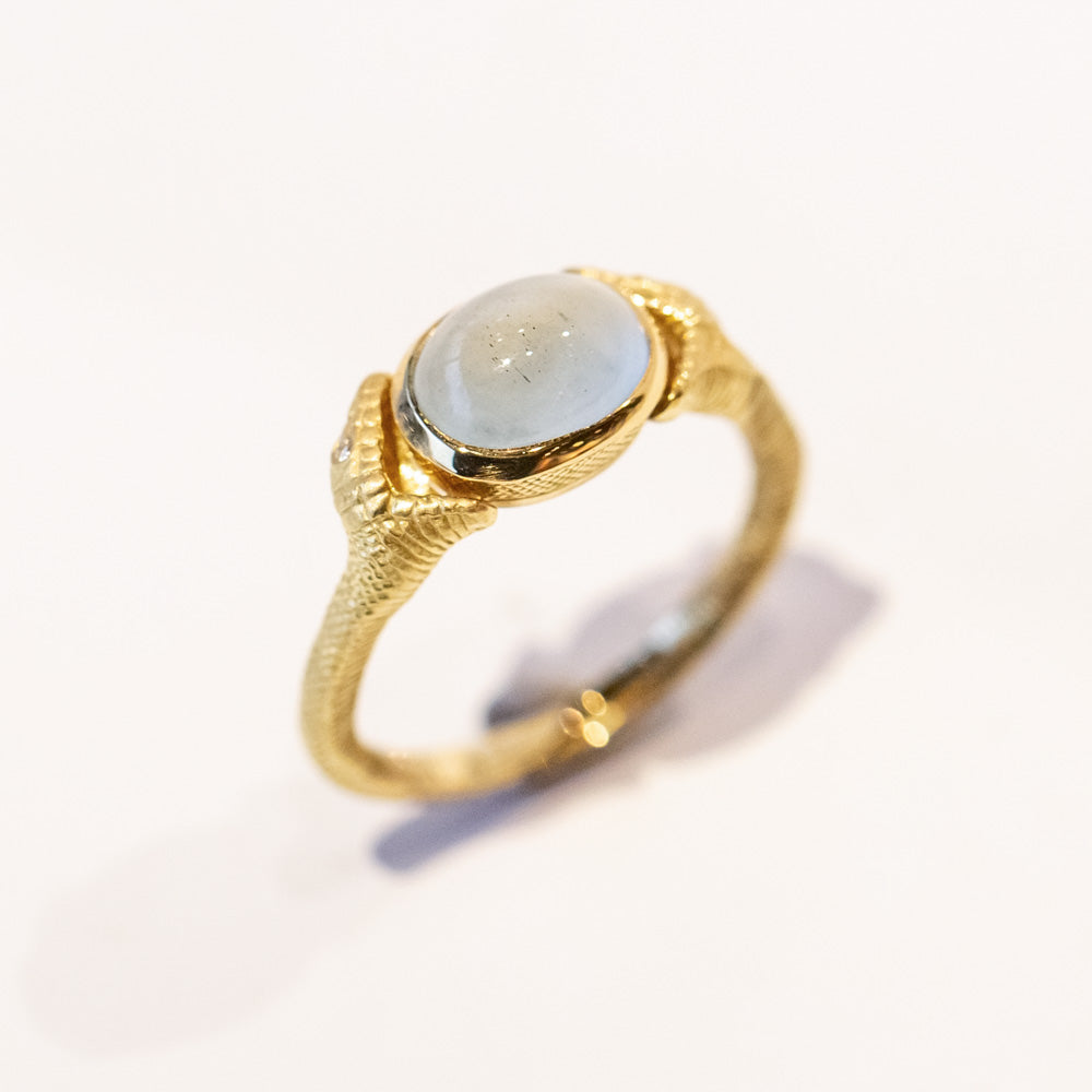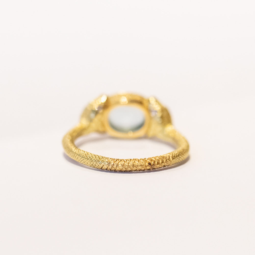 There is undoubtedly something fascinating about creatures that we seem to be hard-wired to be afraid of. The snake, in particular, evokes strong emotions in people. In this Anthony Lent snake ring, you'll find a double-headed creature wrapping its intricately textured form around your finger to embrace a glowing cabochon aquamarine. Each serpent head features a tiny white diamond eye.