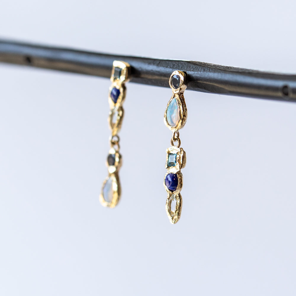 Dive into the deep end. The Waterfall Lapis Earrings by Misa are a cool cascade of luminous blue stones—lapis, topaz, aquamarine, sapphire, and opal—flowing like liquid light. Each stone is bezel-set and asymmetrically arranged for a subtly mismatched pair that moves with you, like sunlight dancing on water.