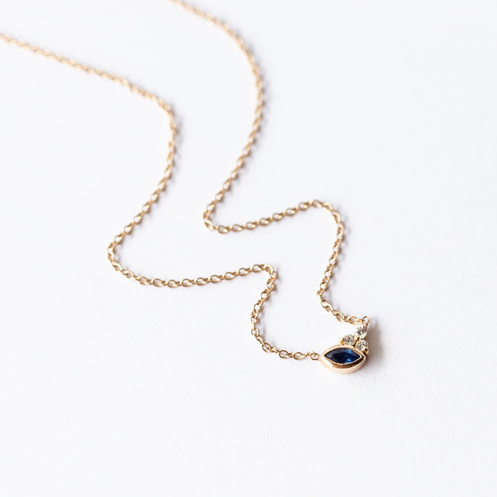 A little something blue, a little something sparkly—this necklace is all about effortless elegance with a modern twist. A deep blue marquise sapphire sits front and center in a sleek bezel setting, while a delicate trio of prong-set diamonds adds just the right amount of shimmer. As September’s birthstone, sapphire is known for symbolizing wisdom, protection, and inner strength, making this piece as meaningful as it is beautiful. Suspended from a fine 14k gold cable chain, it’s perfect for everyday wear, layering, or adding a subtle pop of color to your look.