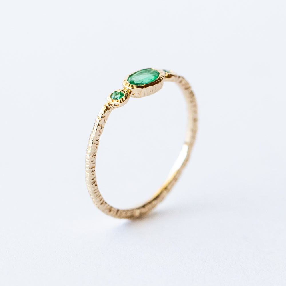 Timeless elegance with a touch of modern design, this three-stone emerald ring features an oval emerald set east to west at the center, flanked by two round emeralds for a striking and balanced look. Each emerald is bezel-set in warm 14k yellow gold, allowing the rich, vibrant green stones to shine. The notched gold band, with its textured finish reminiscent of woven fabric or natural woodgrain, adds an artisanal touch to the sleek design.