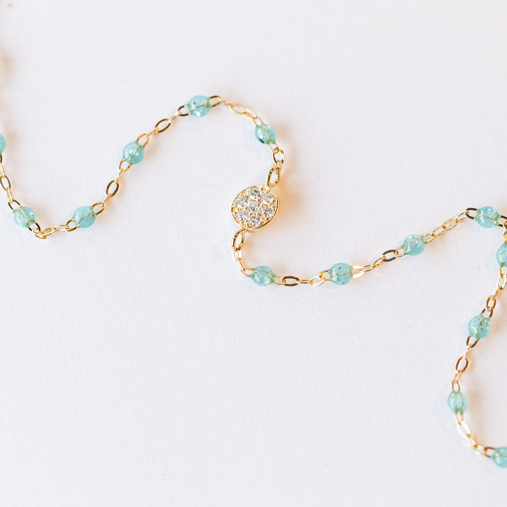 The Gigi Clozeau Classic Puce Diamond Bracelet in Aqua is delicate, dreamy, and endlessly stackable. Crafted in 18k yellow gold, it features a tiny pave diamond disc at the center, giving just the right touch of sparkle. The aqua colorway looks beautiful solo or layered with your favorite bracelets for a subtle, modern wrist glow.