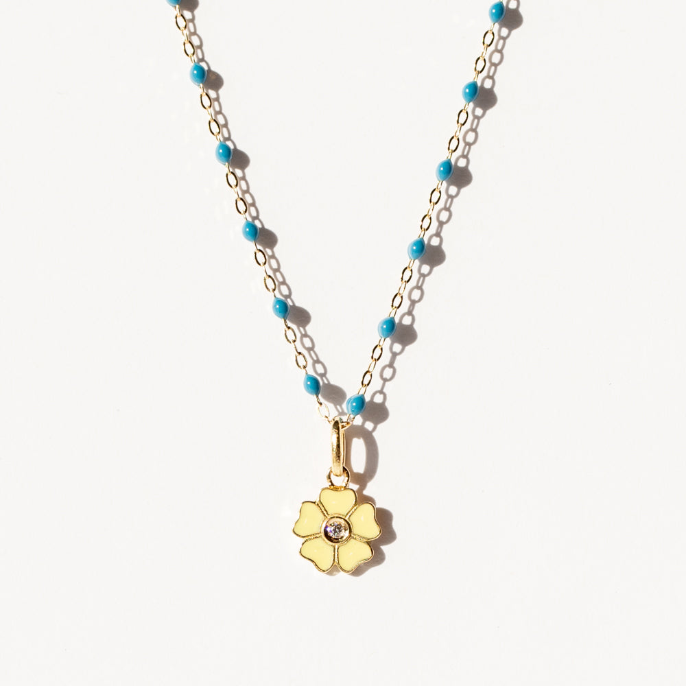 Gigi Clozeau’s Flower Charm in Mimosa is like bottled sunshine — soft, sweet, and effortlessly joyful. Crafted in 18k yellow gold with a glossy resin finish, this tiny bloom features a bezel-set diamond at its heart for just the right amount of sparkle. The Mimosa hue — a buttery pale yellow — adds a warm, happy glow to your favorite chain or bracelet.