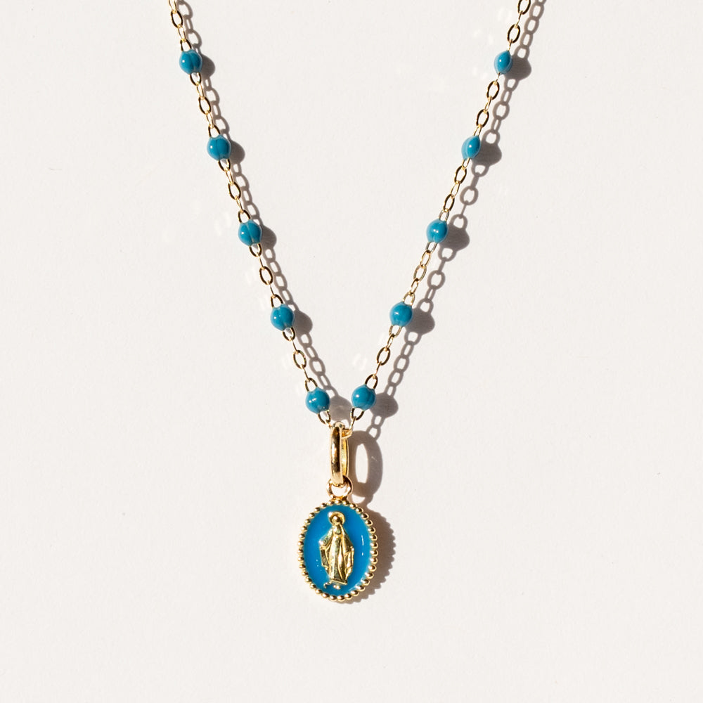 The Gigi Clozeau Blue Madone Charm is a modern tribute to a timeless icon. Crafted in 18k yellow gold and filled with glossy blue resin, this petite charm features the Virgin Mary framed in soft, rounded gold — a symbol of protection, devotion, and everyday grace.