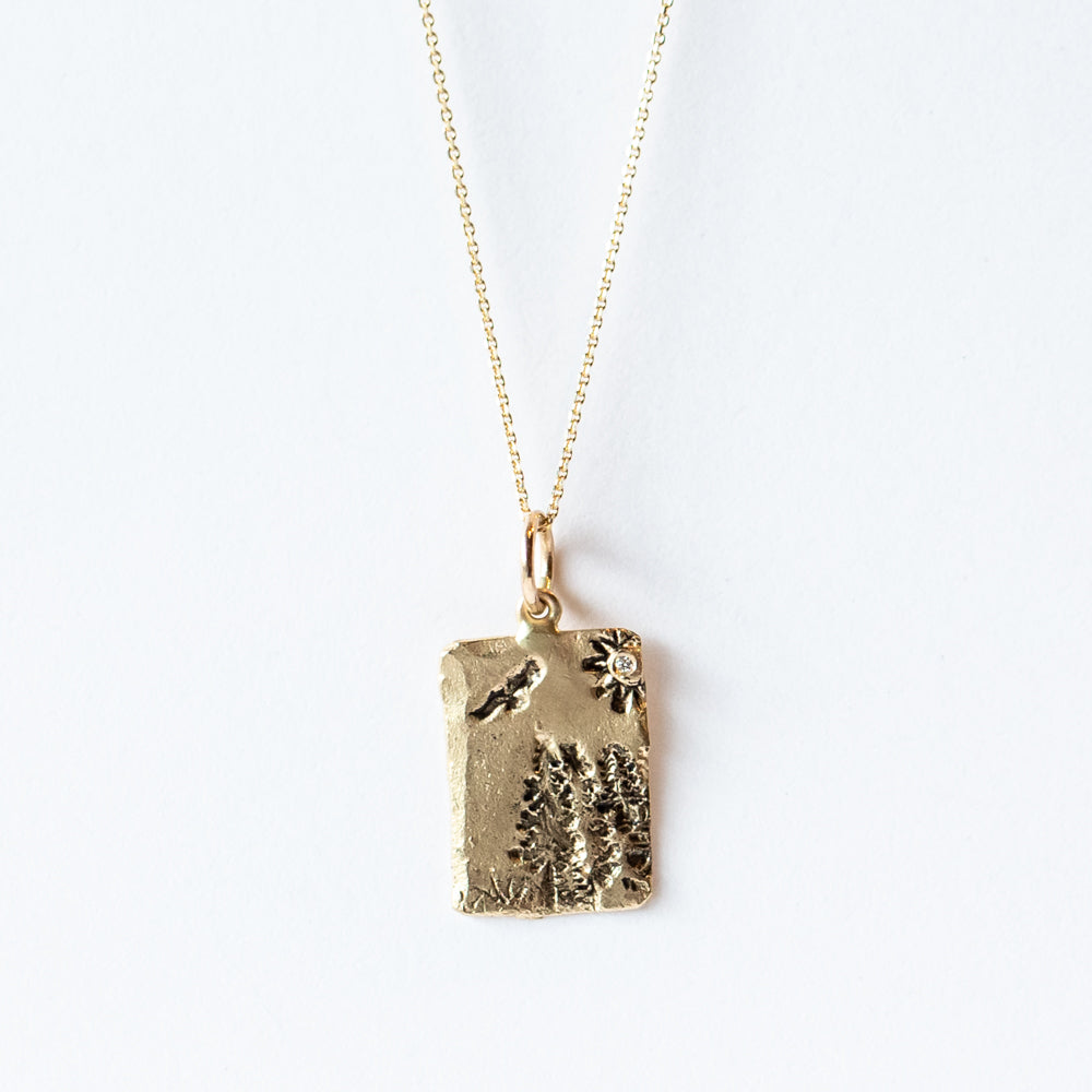 The wilderness beckons! This textured gold charm is stamped with a forest, sun, and soaring eagle. Perfect for your wanderlust. Add it to your choice of chain to create a necklace that's all your own.