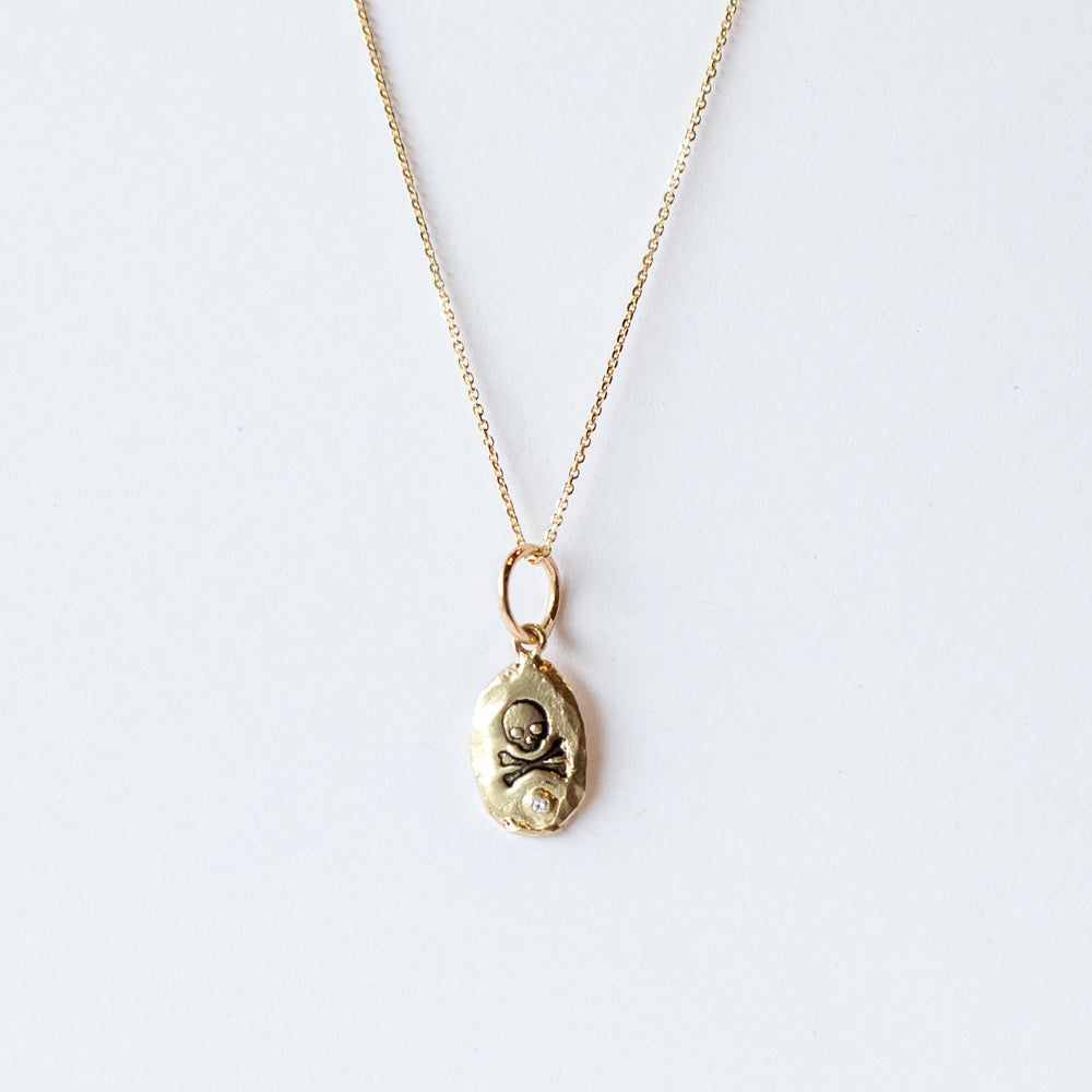 The cutest little skull and crossbones we ever did see. This textured gold charm from Victoria Cunningham is accented with a tiny diamond, perfect for adding to your choice of chain or charm bracelet for a hint of edge.
