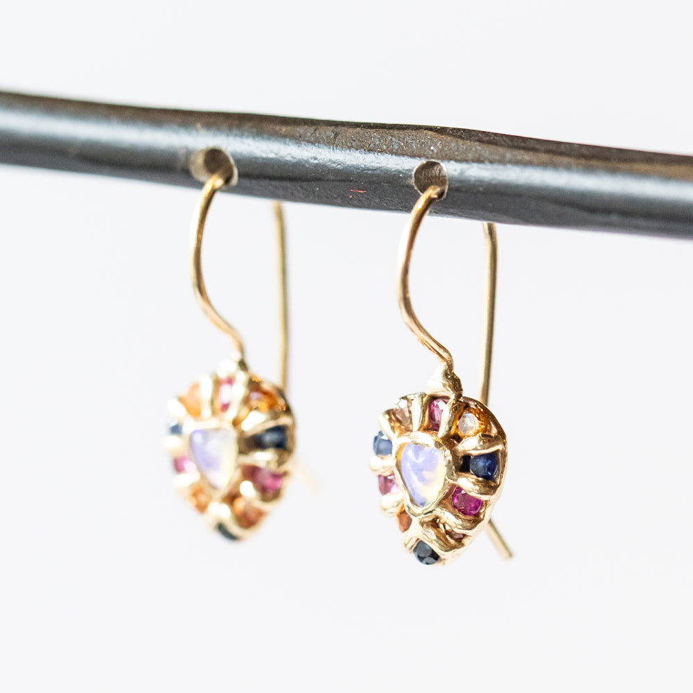 A playful yet luxurious take on romance, the Opal Lover Drop Earrings by Ciara Bowles are designed to steal the show. At the heart of each earring, a heart-shaped Welo opal takes center stage, its shifting hues creating an ethereal glow. Surrounding the opal is a vibrant halo of blue and orange sapphires, with a pop of ruby, adding color and sparkle to this already breathtaking piece. Set in 9k yellow gold, these earrings bring a dash of color, magic, and elegance that’s perfect for those who love to wear their heart on their sleeve. Romantic and bold, these earrings are ready to be your new statement piece.