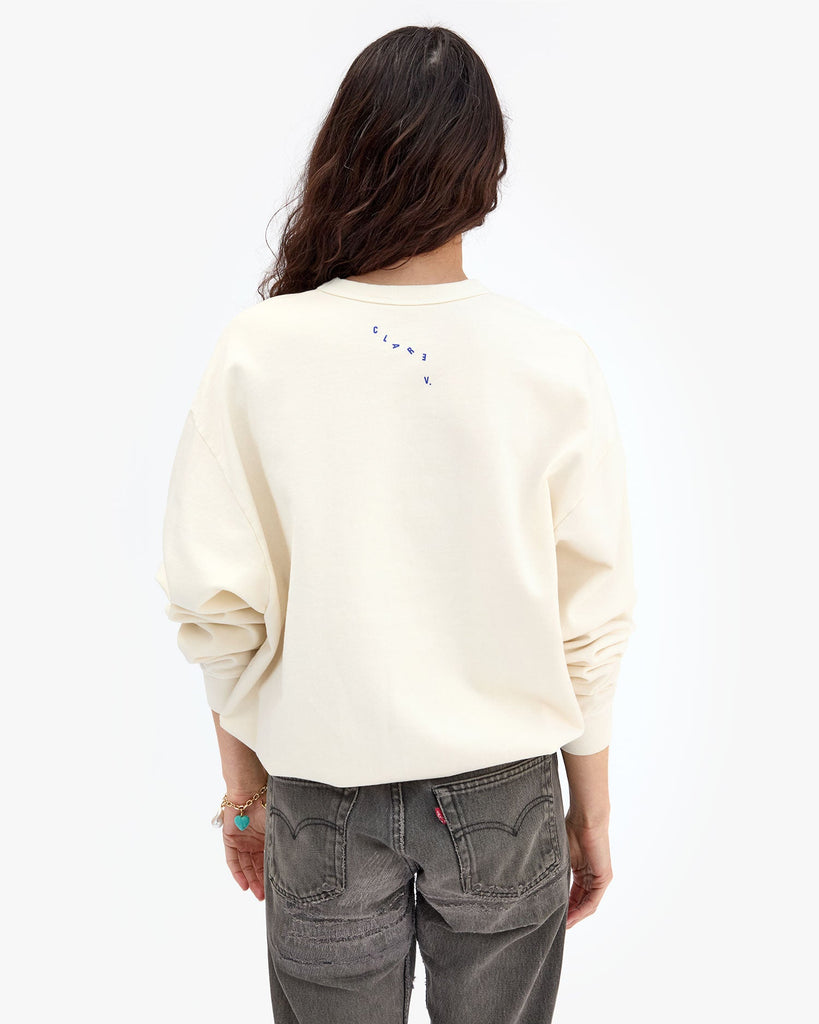 Turn up the energy with Clare V.’s oversized Le Vibe sweatshirt in cream with bold cobalt lettering. Soft, relaxed, and effortlessly cool, it’s a cozy layer anyone can rock—perfect with jeans, joggers, or layered over a favorite tee for that off-duty vibe.