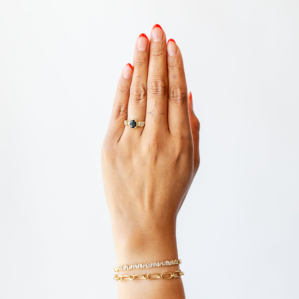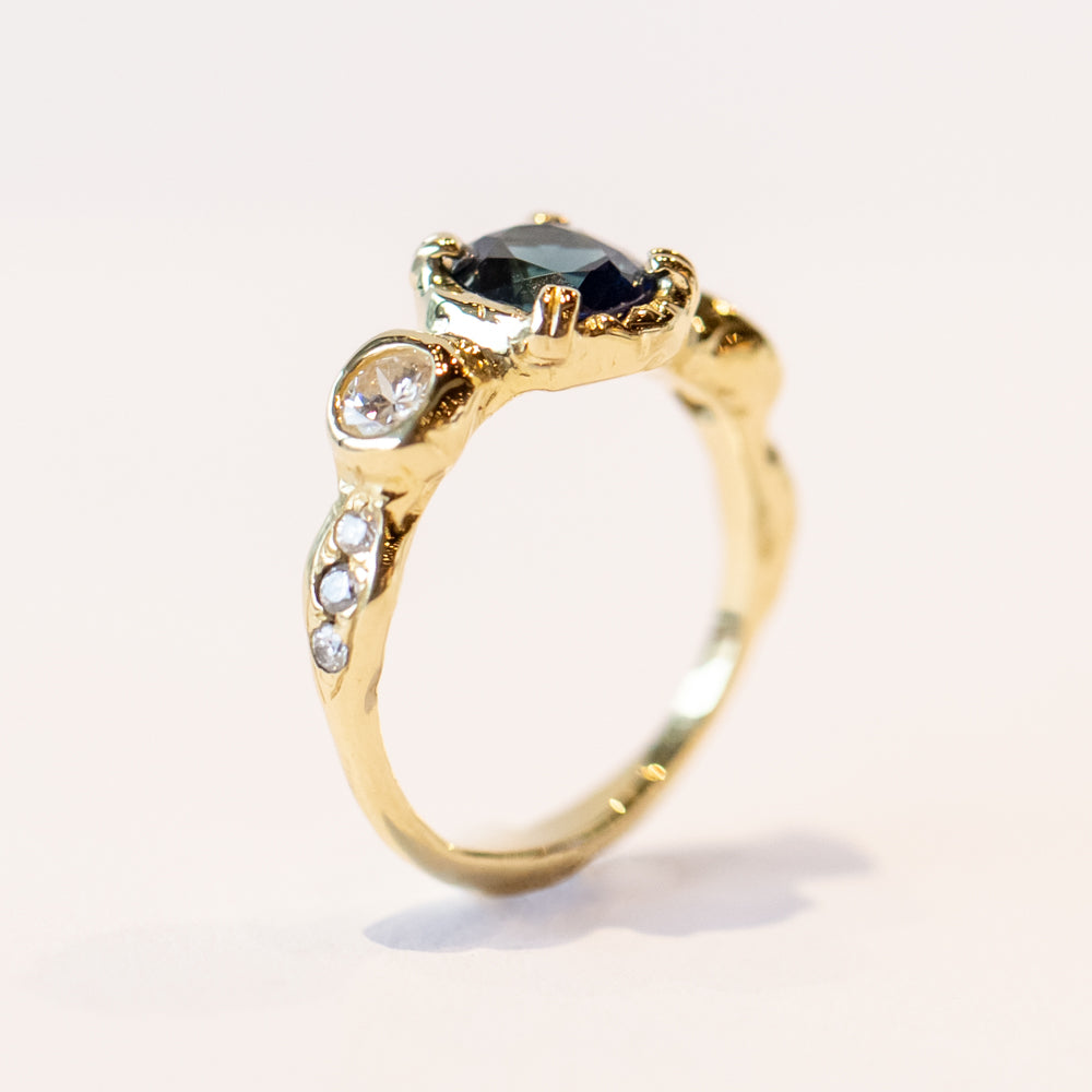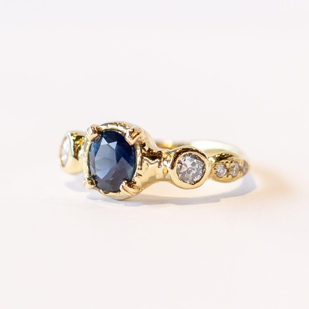 Crafted in Communion by Joy's signature hand-carved style, this stunning sapphire engagement ring celebrates your everlasting love with royal fervor. A deep blue oval sapphire shimmers at the center of this low-profile engagement ring, flanked by two bezel set round diamonds and six petite pave diamonds down the shoulders. It's a unique take on a classic three-stone ring, crafted with organic style and perfectly suited to modern love—like yours. Wear it alone, or pair it with other rings to create your own wedding ring stack.