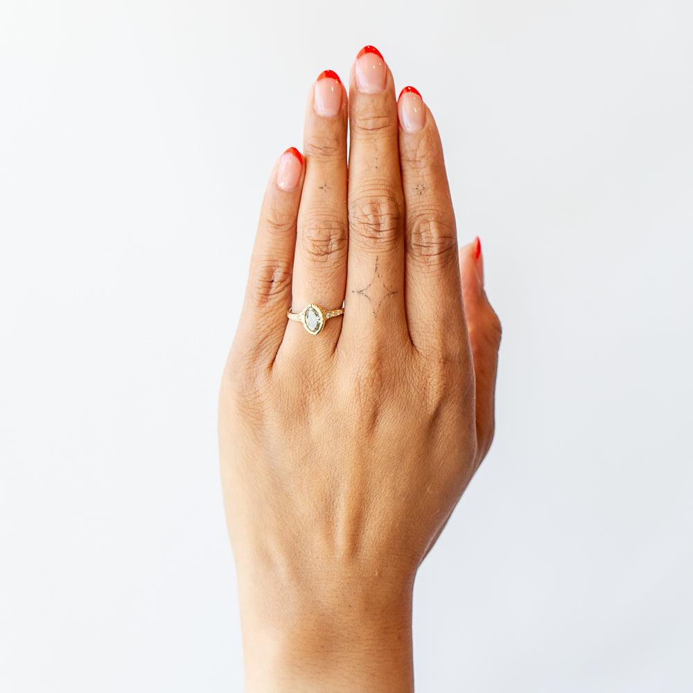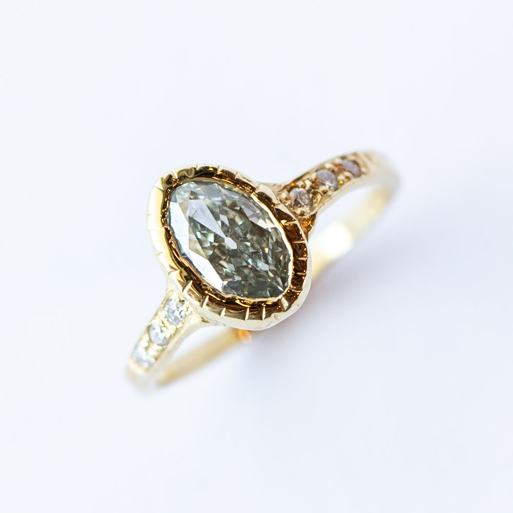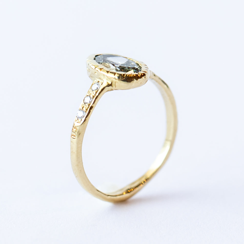 A true sparkler with tons of personality, this gorgeous diamond engagement ring is one-of-a-kind. It features a moval-cut (basically an oval with pointier points like a marquise) in a super low-profile bezel setting, which is perfect for active hands. This golden-gray stone is accented by tiny white diamonds in each shoulder of the ring and features Joy's signature organic textured gold. Wear it alone or pair it with your choice of wedding band.