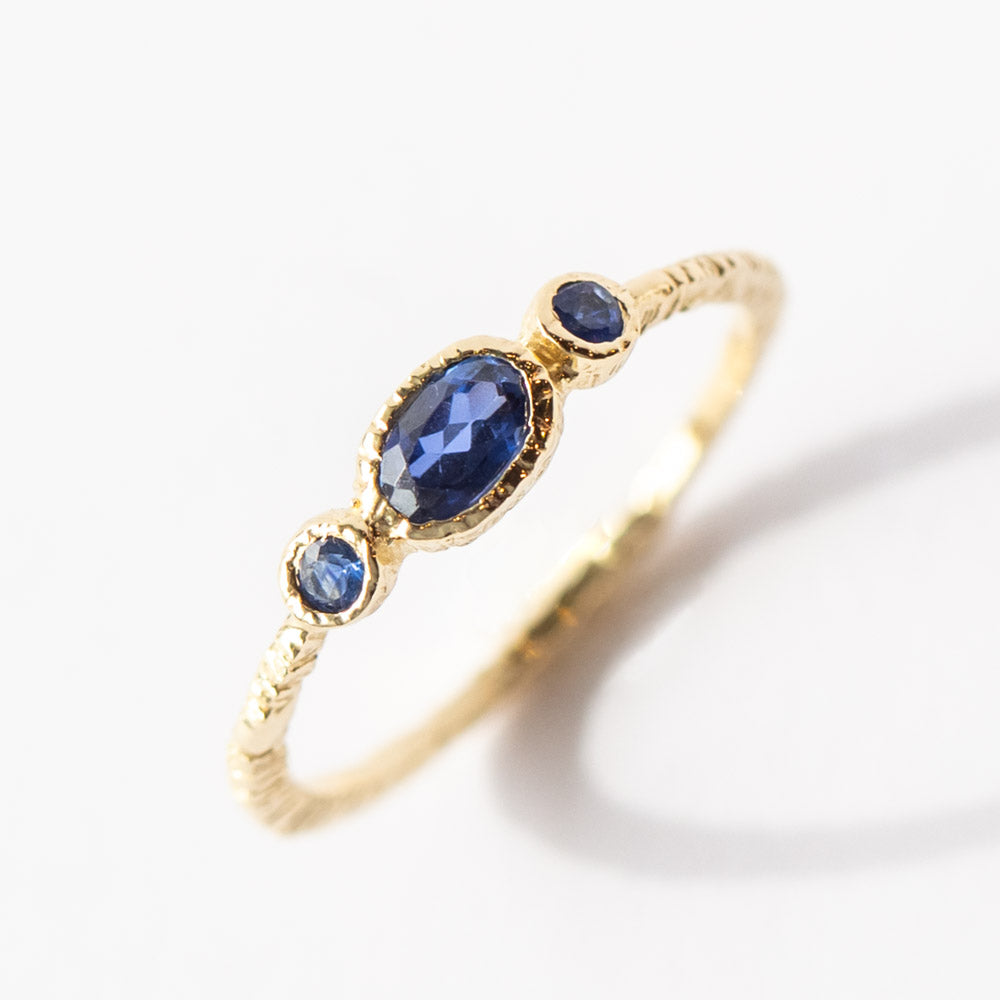 A trio of sapphires—one horizontal oval framed by two tiny rounds—brings subtle color to this petite textured gold ring from designer Danielle Welmond. Sapphires are September’s birthstone, long associated with wisdom, loyalty, and a calm, grounded energy. Wear it solo for a little pop of color or stack it with other gold rings to create a layered look.