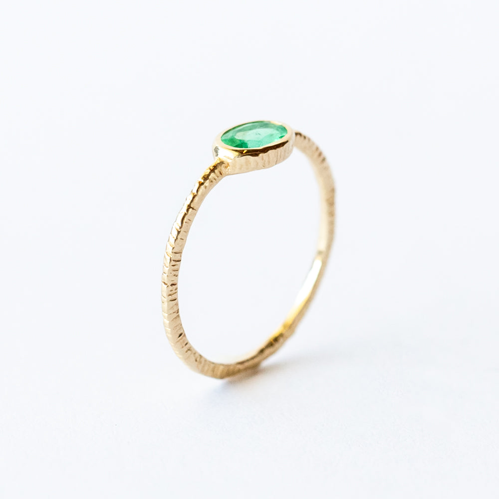 A pop of vibrant green is just the thing in this simple and stackable emerald ring from designer Danielle Welmond. The oval emerald, bezel set in bright, textured 14 karat yellow gold sits in an east-west orientation for a modern, on-trend look. The simplicity of the design allows the brightly colored gemstone to take center stage, while the notched gold band, reminiscent of woven fabric or natural woodgrain, adds an organic touch.
