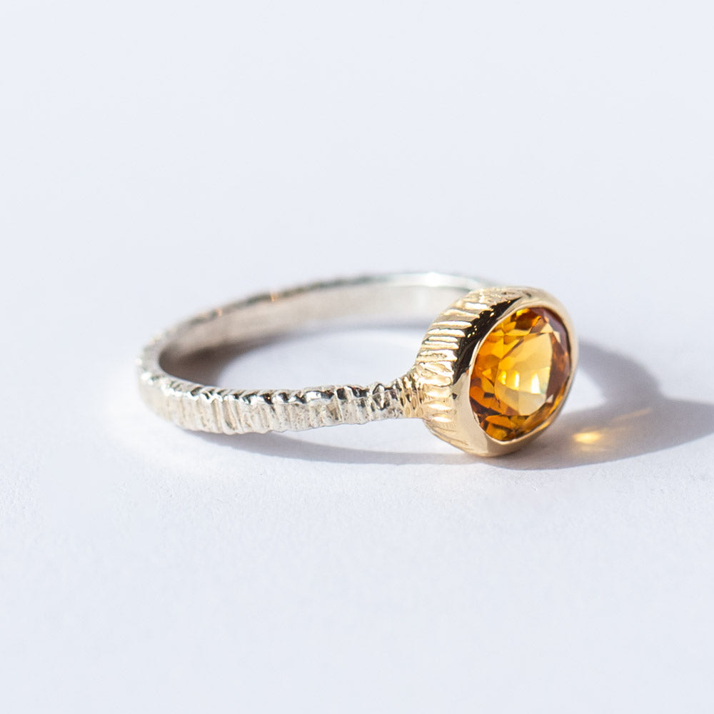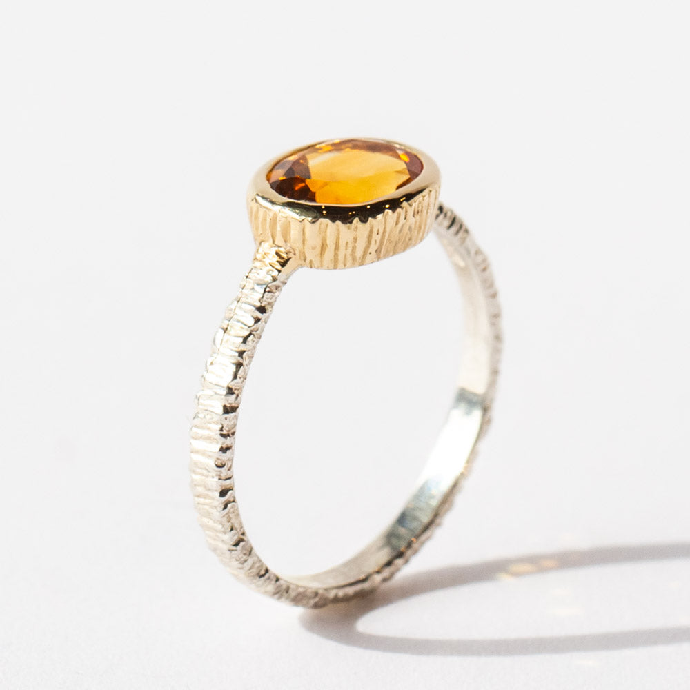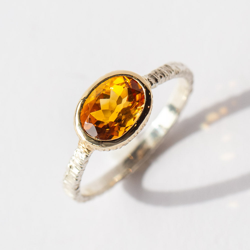 A sunny oval citrine sits in a warm 14k gold bezel atop a softly textured sterling band—Danielle Welmond’s signature mix of modern metalwork and handmade charm. Citrine, November’s birthstone, is known as the “stone of abundance,” said to attract joy, creativity, and all-around good vibes. A perfect everyday pop of golden light.