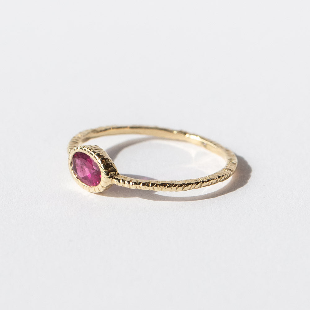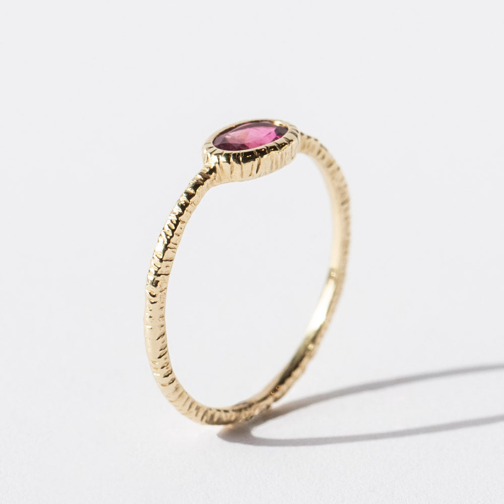 A rich, wine-toned rhodolite garnet gives this Danielle Welmond ring a dramatic, romantic mood. Set in warm 14k yellow gold with her signature textured finish, the oval-cut gemstone feels both timeless and quietly bold. It’s a piece that stands out whether paired with your ring stack or worn on its own.