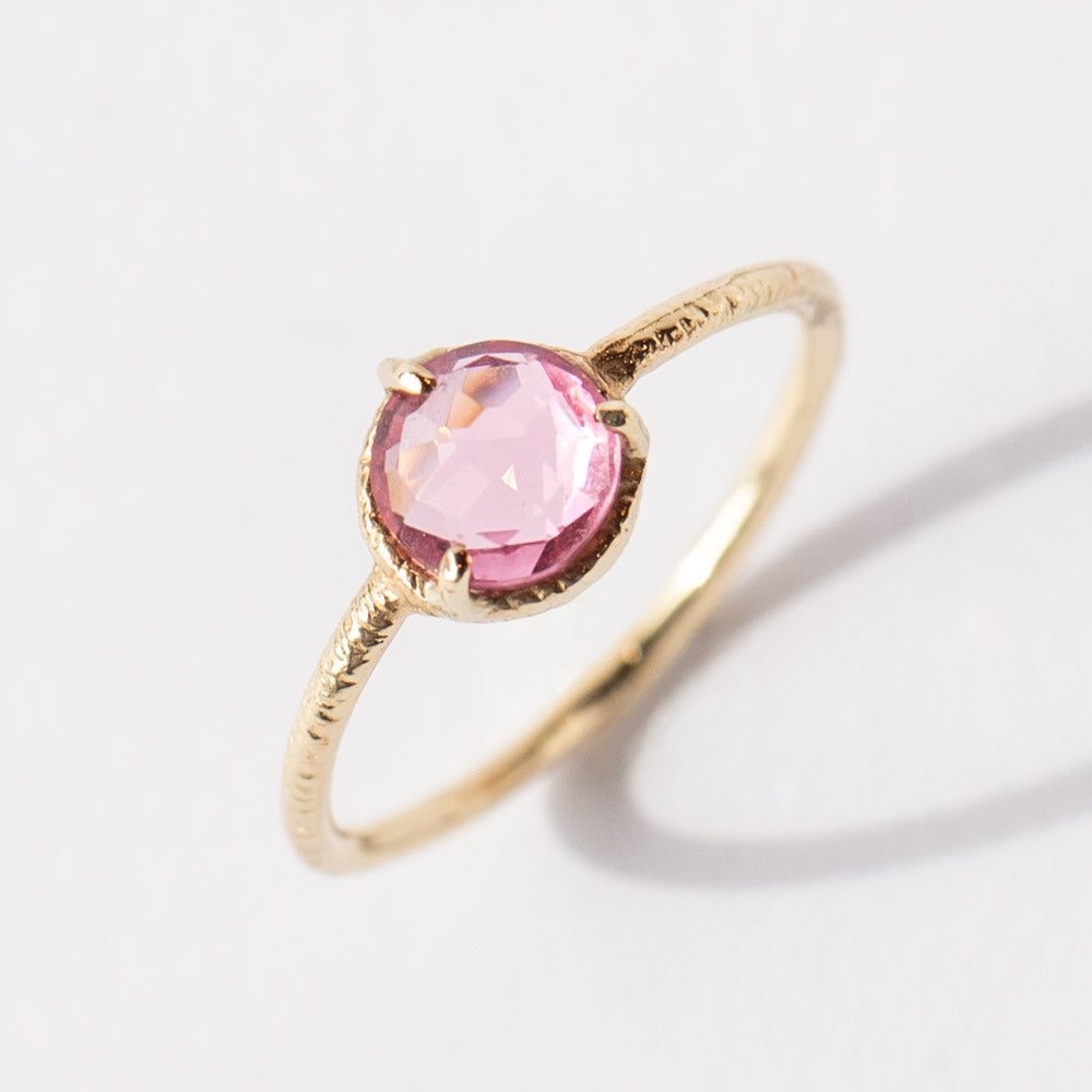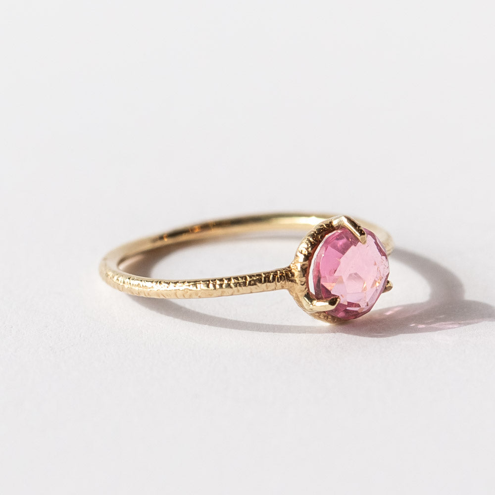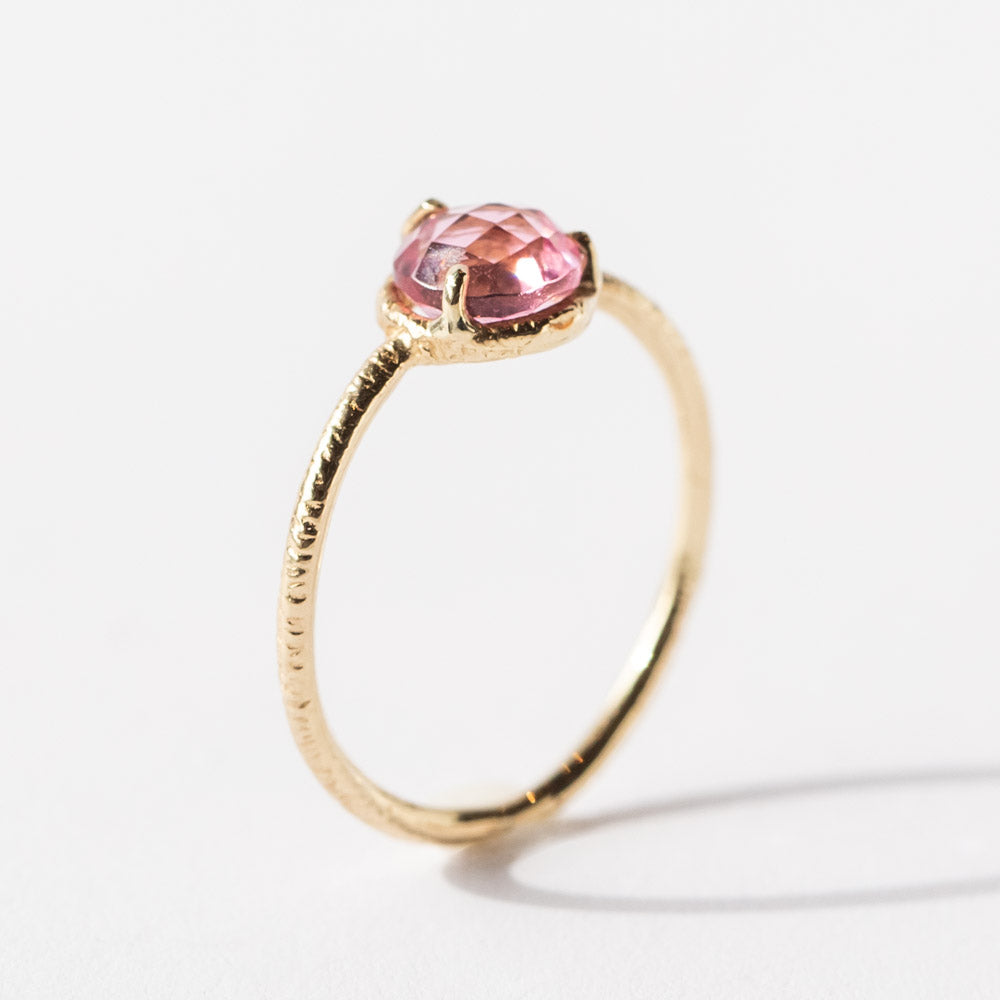 Soft, luminous, and a little unexpected, this pink quartz ring from Danielle Welmond brings dreamy color to your everyday stack. Set in warm 14k yellow gold, the round, rose-cut gemstone floats delicately in a three-prong setting that lets the light play through every facet. The effect? Effortless and modern with a whisper of vintage romance.