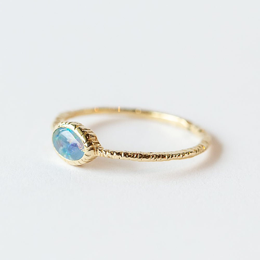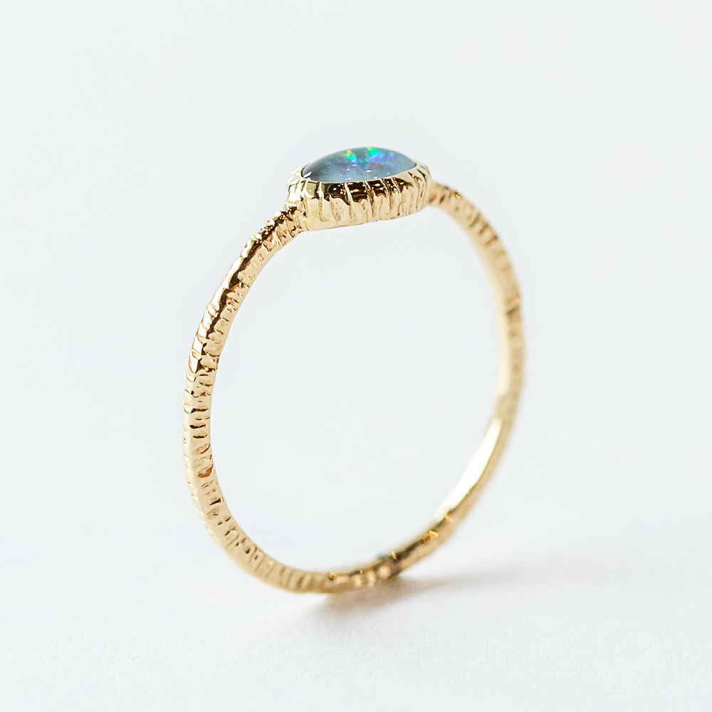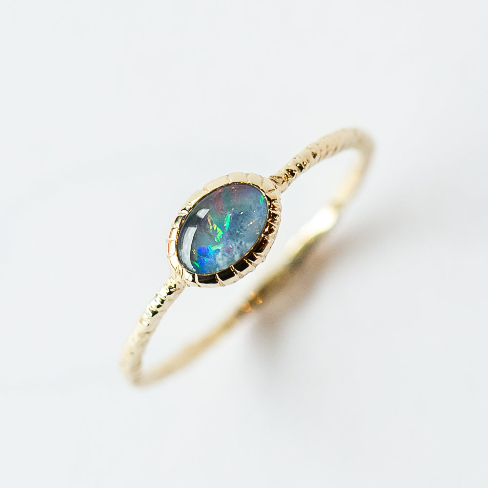 A dainty oval-shaped opal shimmers with flashes of rainbow color, wrapped in a warm 14k yellow gold bezel with a subtly textured finish. Opal, October’s birthstone, is celebrated for its dreamy play of light and ties to creativity, intuition, and inspiration. This ring has a delicate scale that makes it easy to wear or stack with your other favorites, yet the shifting fire in the stone ensures it never feels ordinary.