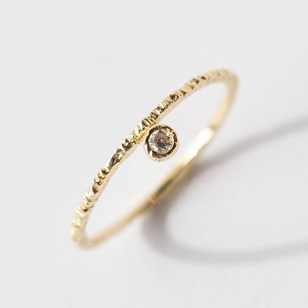 Playful and modern, this Danielle Welmond diamond ring features a petite 2mm bezel-set diamond perched off-center on a textured 14k yellow gold band. Perfect for stacking or wearing solo for a minimalist statement.