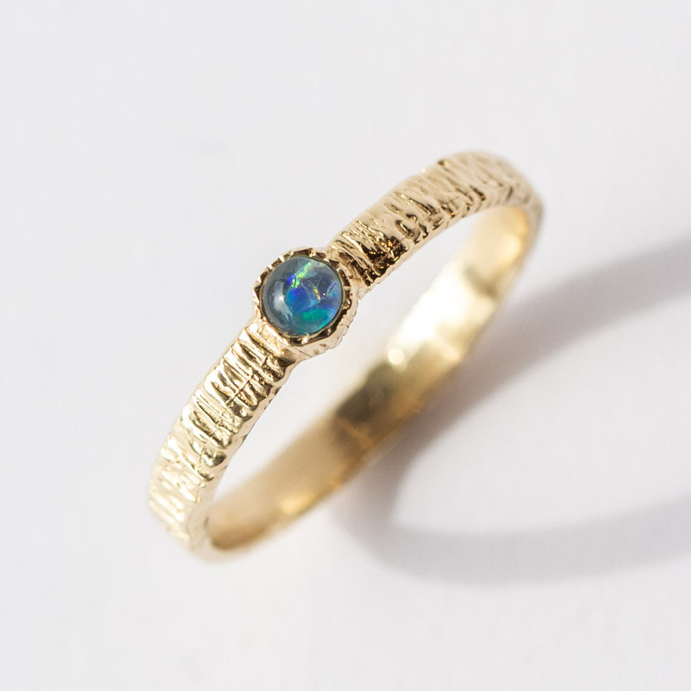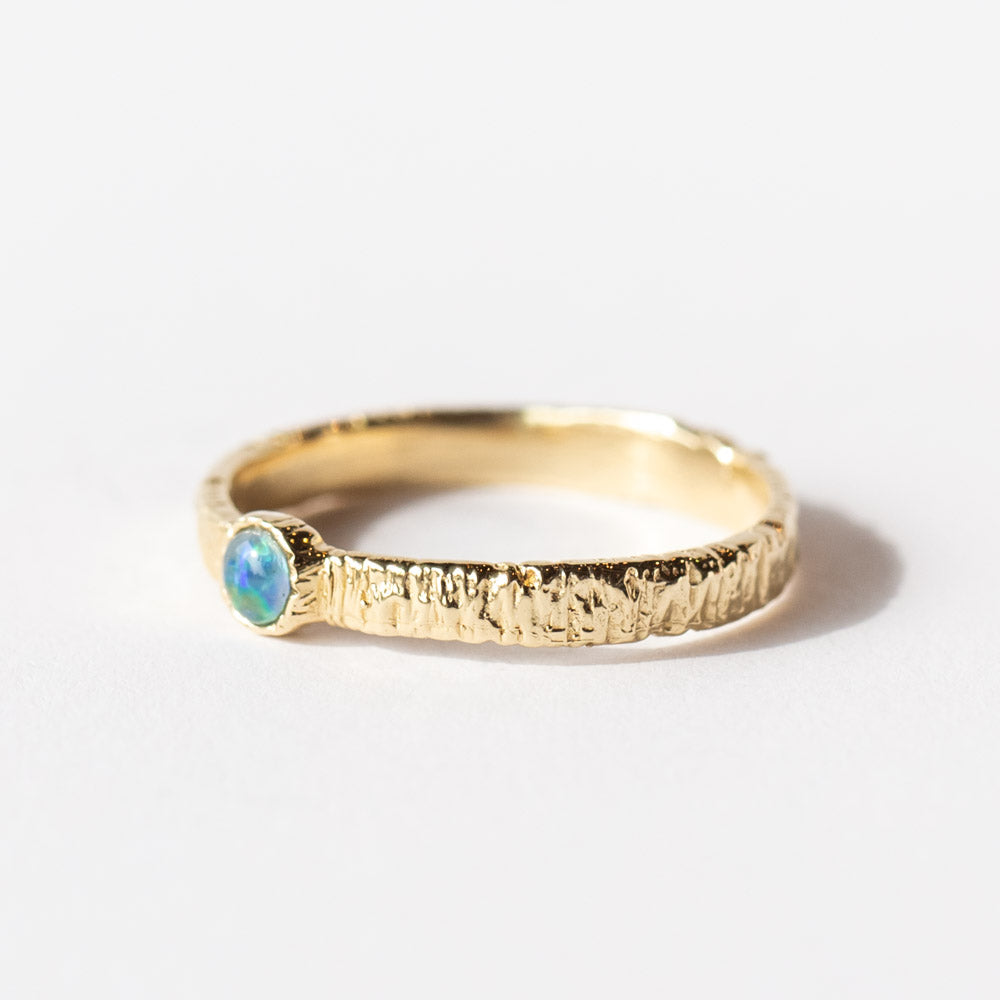 Danielle Welmond’s Tiny Round Opal Ring proves that small can still be striking. A single 3mm round opal shimmers with bright flashes of color, set atop a textured wide 14k yellow gold band that feels both modern and organic. It’s a quiet statement piece—minimalist in design but rich in personality.