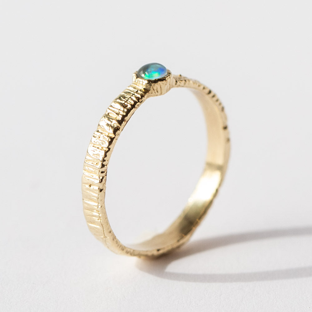 Opal, October’s birthstone, is known for its ethereal play of color and its ties to creativity, love, and emotional renewal. Whether worn solo or stacked with slimmer bands, this little beauty brings a touch of magic to your everyday lineup.