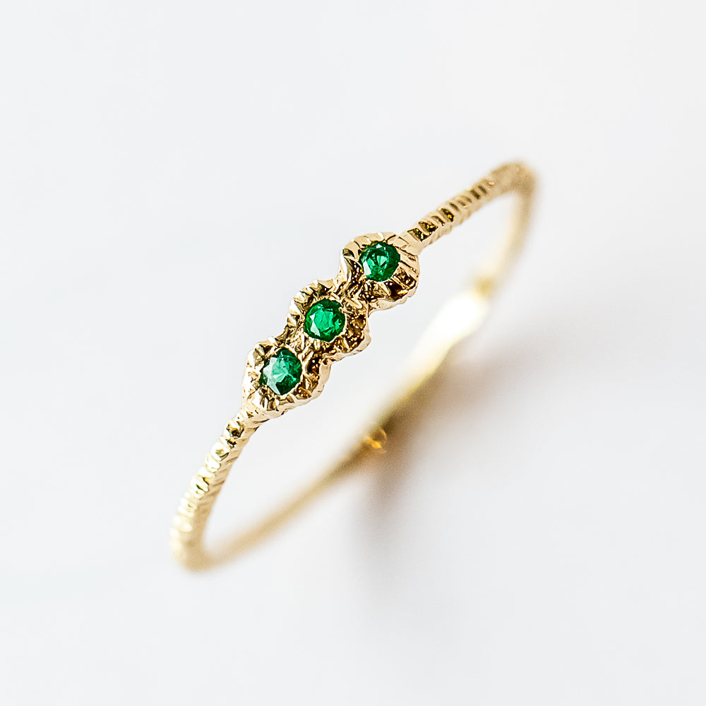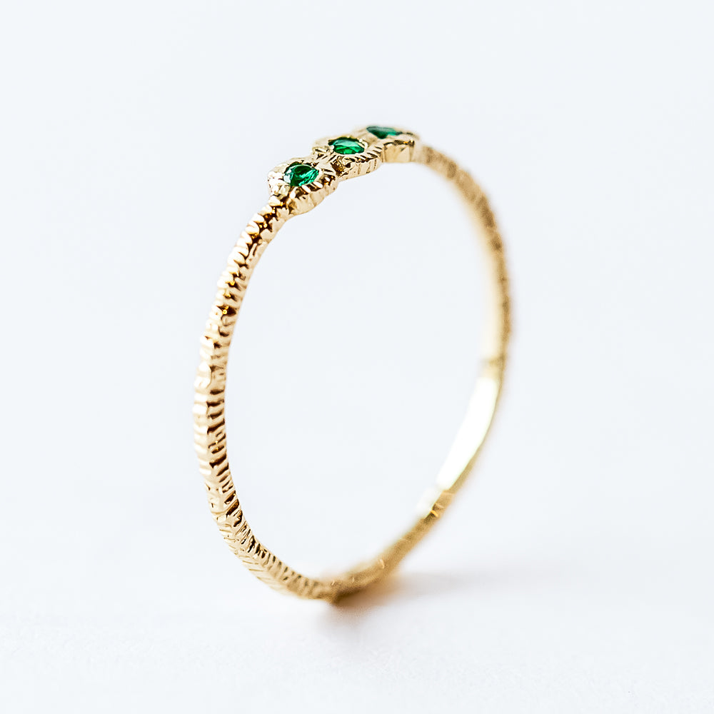 Three tiny emeralds glow in a bezel-set row, framed by Danielle Welmond’s textured 14k yellow gold. Emerald, May’s birthstone, is tied to renewal, love, and fresh beginnings, bringing a vibrant green energy to this delicate stacking ring. Wear it layered with other bands for color play or let it shine solo as a subtle yet meaningful accent.
