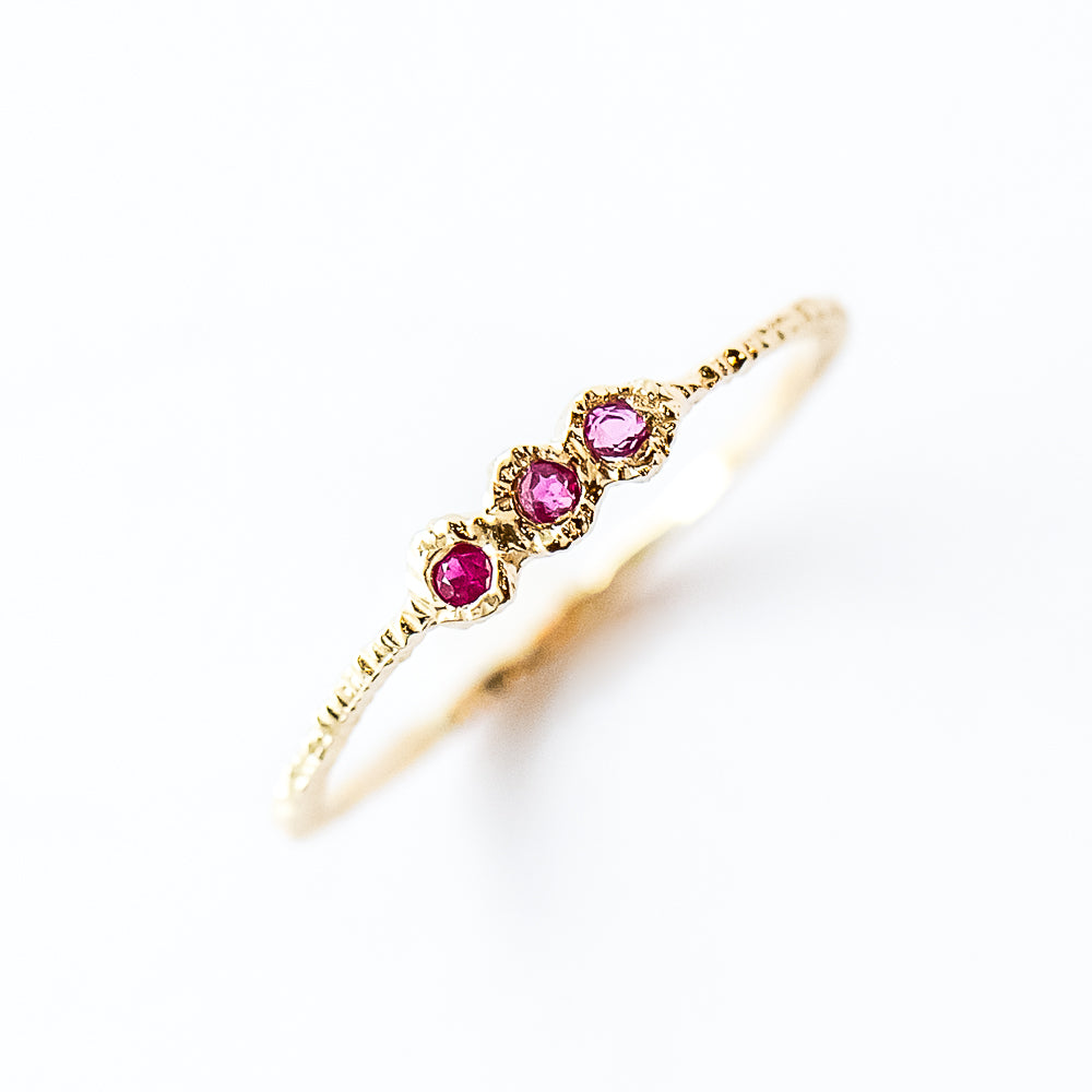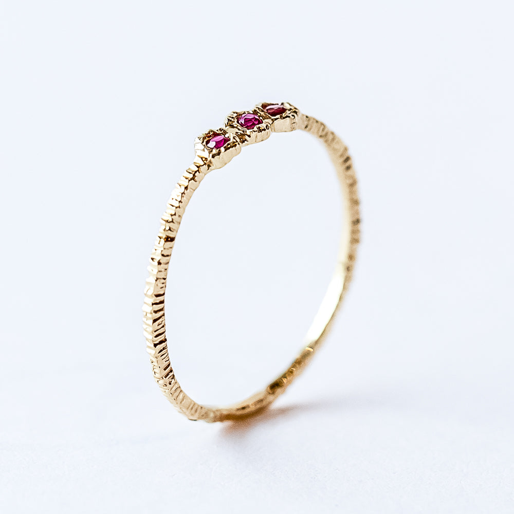 Three dainty rubies line up in a horizontal row, bezel-set in Danielle Welmond’s signature textured 14k yellow gold. Ruby, July’s birthstone, symbolizes vitality, passion, and protection, giving this delicate ring a powerful energy despite its understated scale. Perfect for stacking with your other favorites or wearing solo as a subtle spark of color.