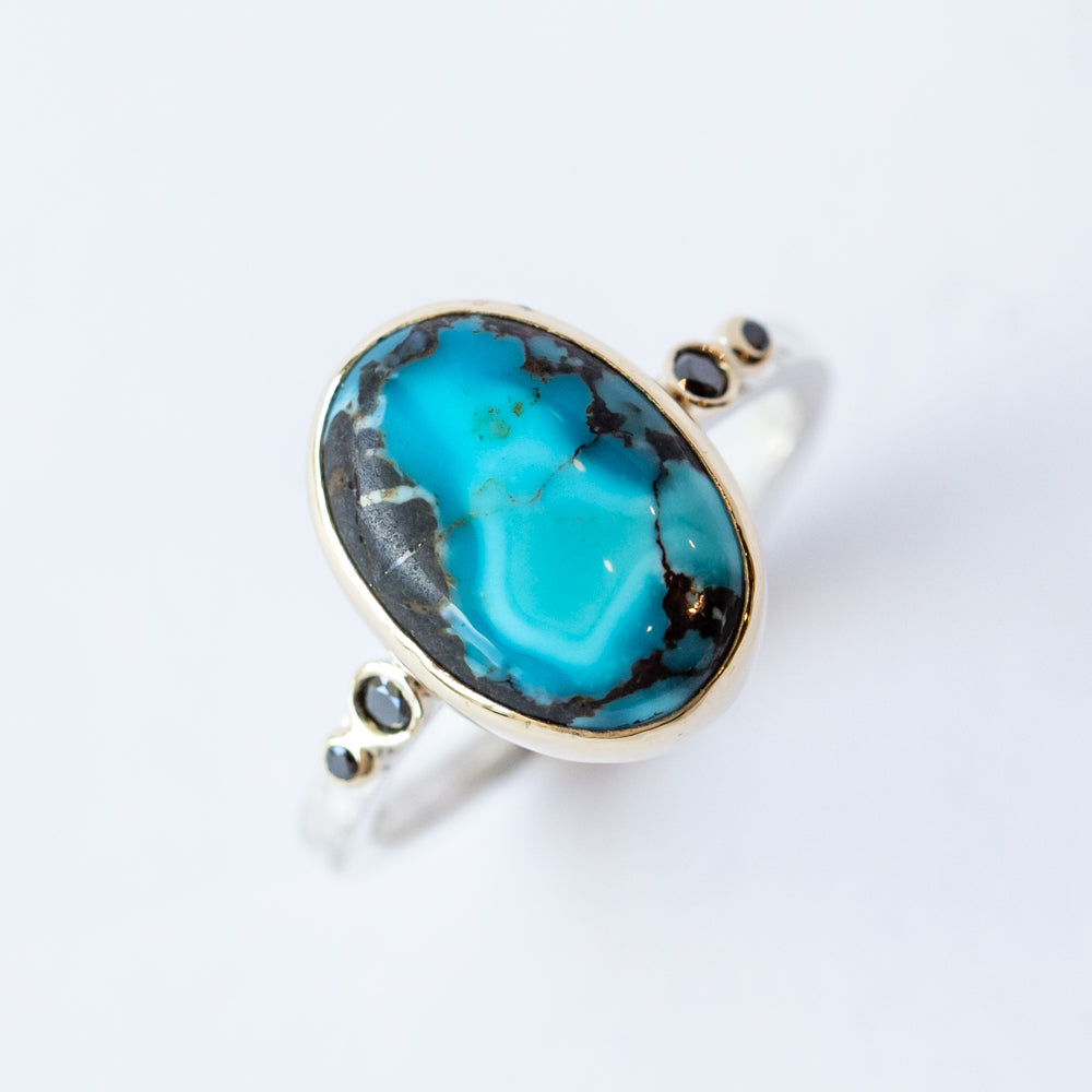 This one’s got serious main character energy. A striking oval Lone Mountain turquoise glows in tones of teal and indigo, like swirling desert skies just after sunset. Framed in warm 14k yellow gold and flanked by moody black diamonds, it’s got just the right mix of drama and depth.