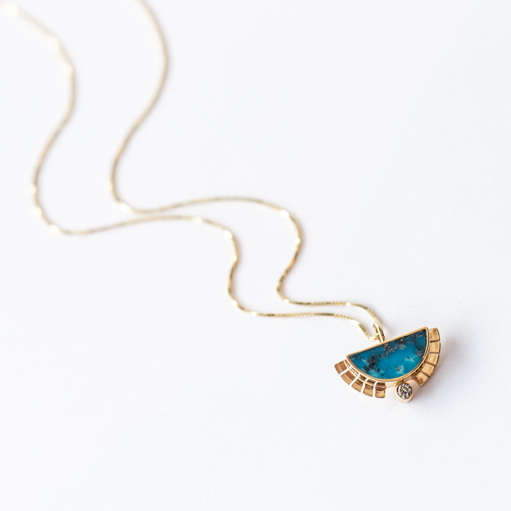 Hanging from a sleek gold box chain, this turquoise and diamond necklace is a go-to for layering or solo wear. Whether you’re chasing the sun, grounding into a new chapter, or just looking for a gold pendant necklace that feels as meaningful as it is beautiful—the Rising Sol has you covered.