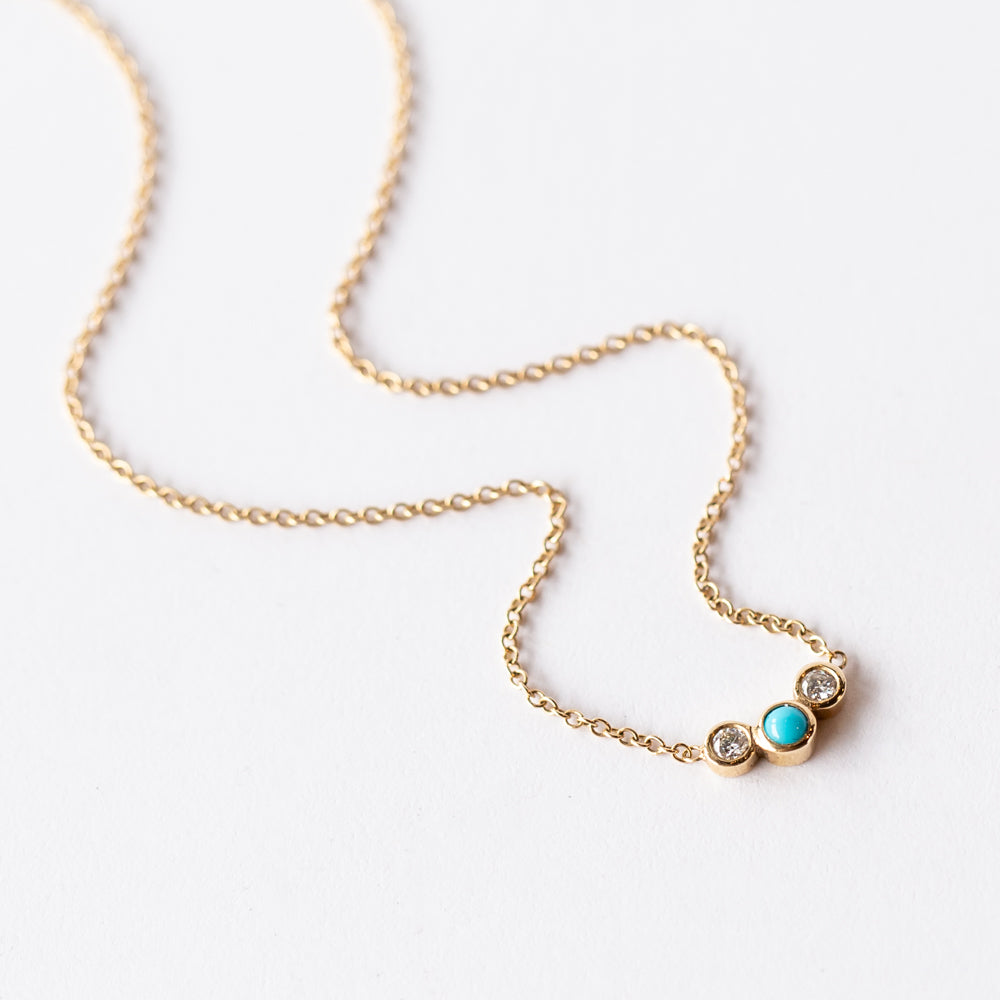 Meet your new summer jewelry MVP: the Graduated Diamond and Turquoise Necklace by Zoe Chicco. This dainty piece features a pop of bright turquoise stationed at the center of a fine 14k yellow gold chain, flanked by two sparkling white diamonds for that extra shimmer. All three stones are bezel-set, giving this necklace a modern, polished finish that’s easy to love.