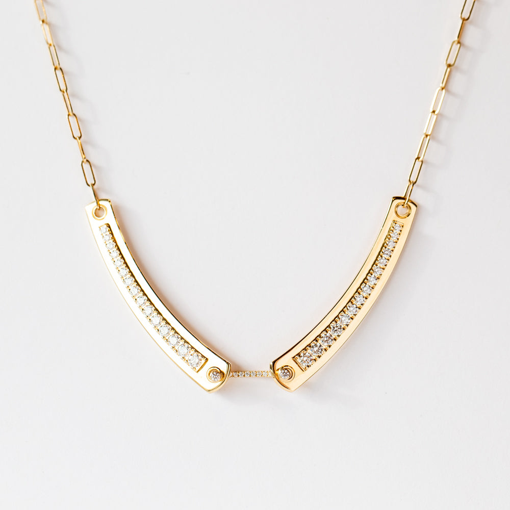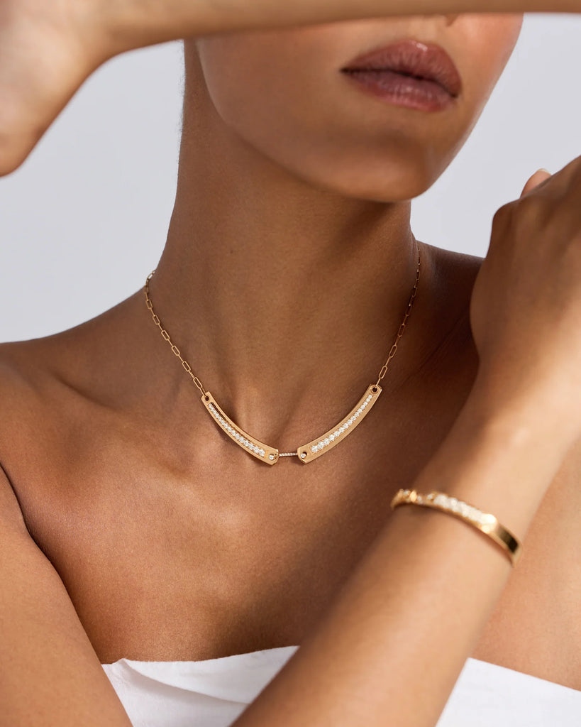 As classic as its namesake, the Tuxedo Mood Necklace lends any outfit a slice of polish and brilliance. Crafted in solid 18 karat yellow gold and set with a line of sparkling diamonds like a sweeping pinstripe, this collar-style necklace gives you instant glam.