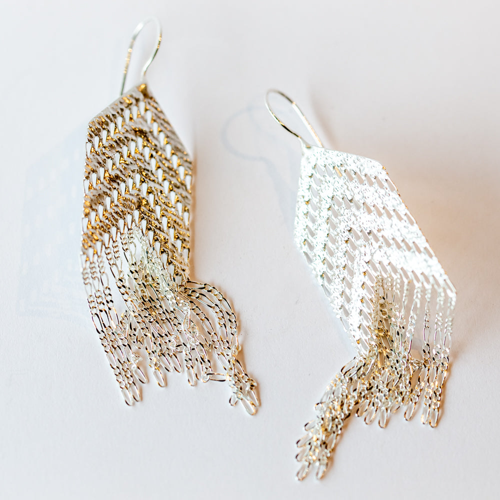 These incredible silver earrings add light and movement to your look. Handcrafted with dainty silver chains, Hannah Keefe has used silver solder to create a lacy chevron at the top with loose chain ends that sway with every move.