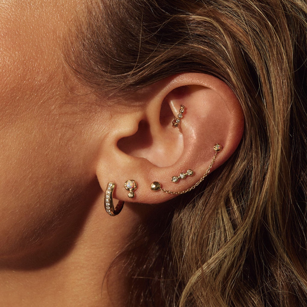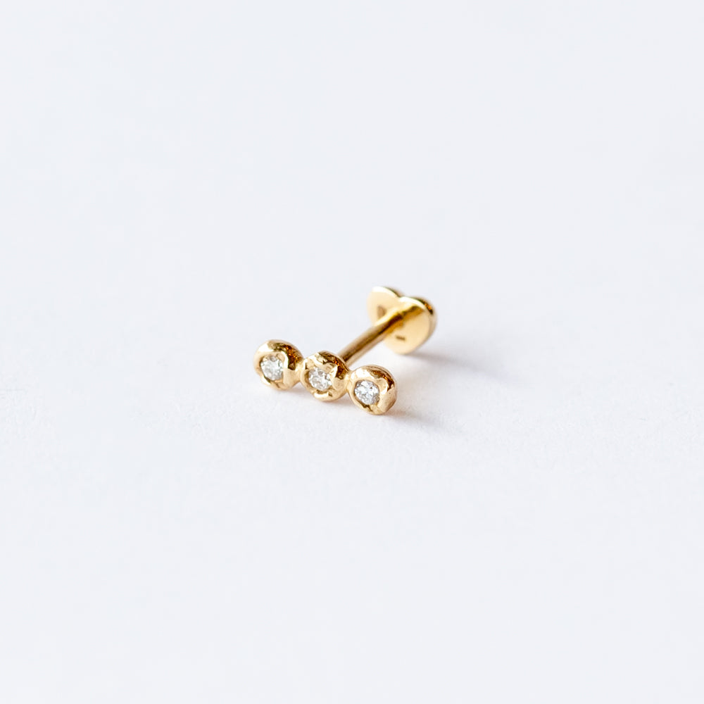 This trio of diamonds encased in molten bezel settings plays perfectly with the proportion of the ear, especially striking for an upper lobe piercing.
