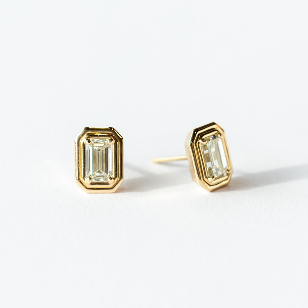 These jaw-dropping diamond stud earrings are a shop favorite. Featuring sizable emerald-cut diamonds, prong set atop a bold gold outline that echos the shape of the diamond, they will definitely stand out in the crowd. The design accentuates the "hall of mirrors" effect of the emerald cut, giving you major flash with zero effort. Wear them solo for a classic look or mix and match them with other earrings for a layered style. You won't want to take theme off.