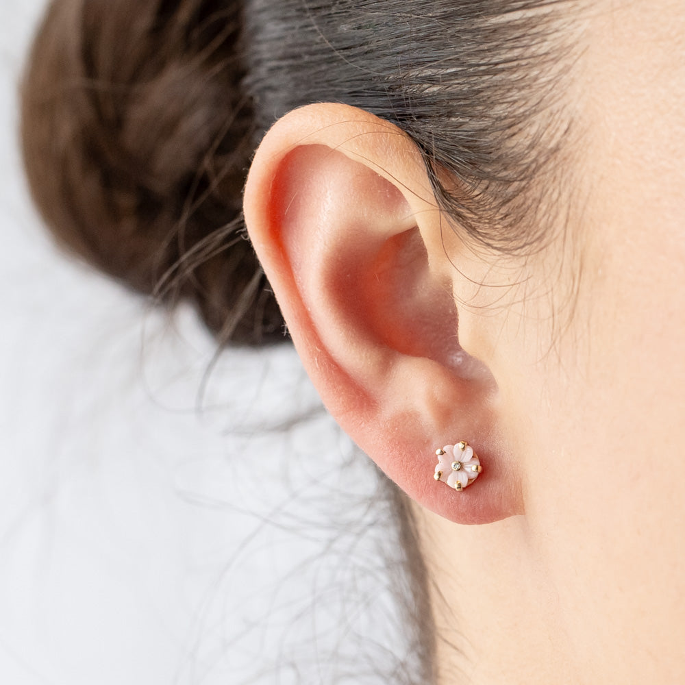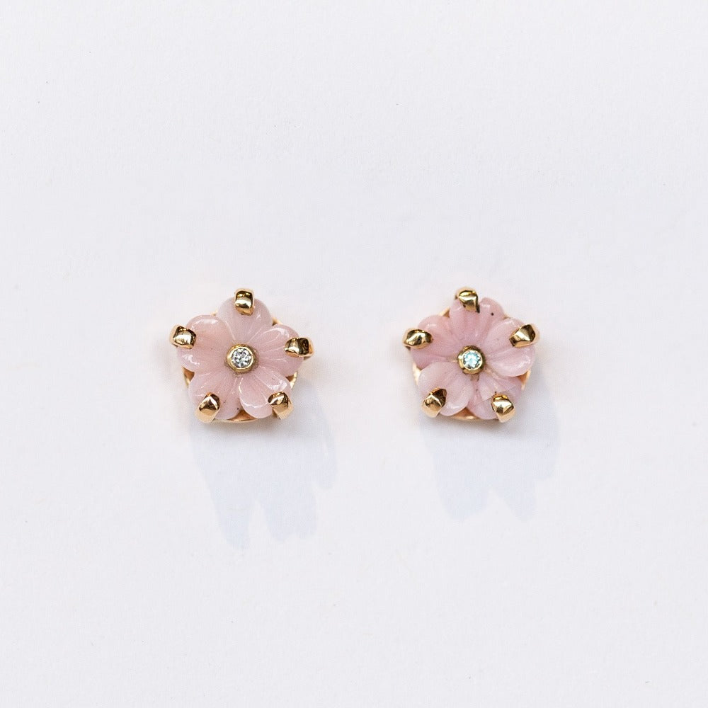 These dainty flower stud earrings are crafted from pale pink Queen Conch shell, hand-carved into intricate floral shapes, and prong set in gleaming 14k yellow gold. At the heart of each flower lies a sparkling little white diamond, adding a touch of brilliance to the soft pink tones of the shell. Perfect for those who appreciate both natural beauty and sophisticated craftsmanship.