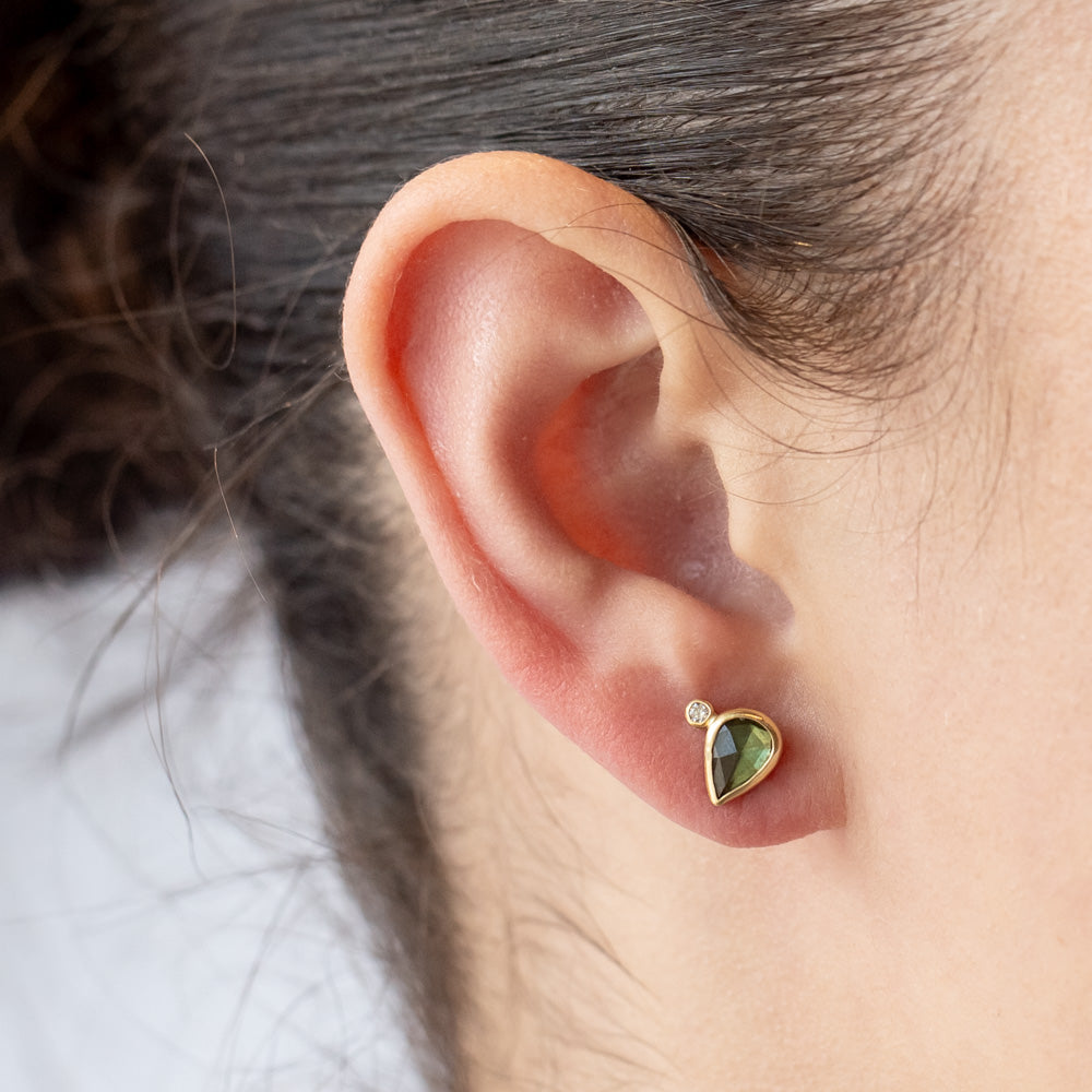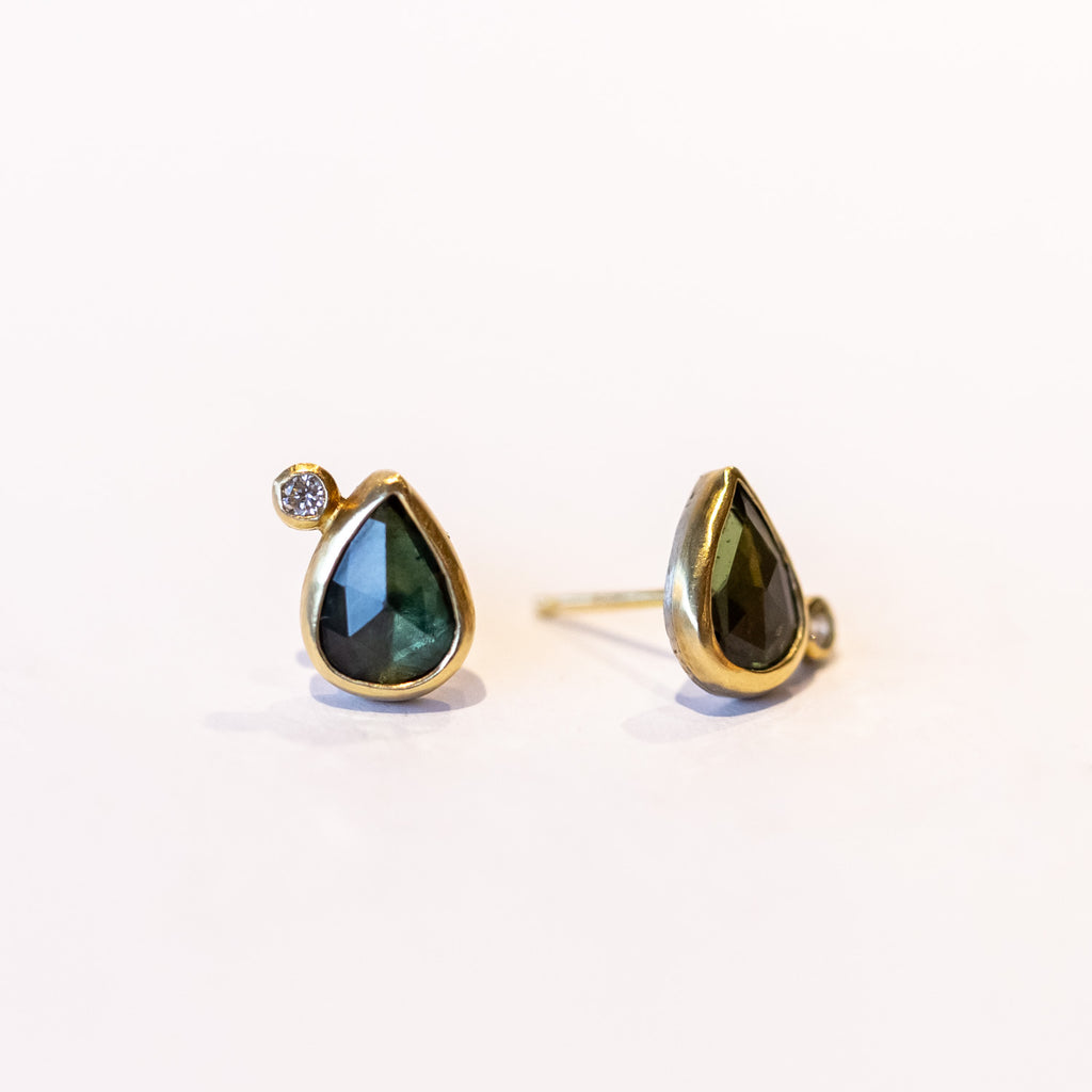 These stunning earrings feature pear shaped rose cut green sapphires set in 18 karat gold bezel. The stones are backed with sterling silver and the studs are finished with 18 karat posts. Incredibly lightweight but with a big impact, there are comfortable and wearable every day.