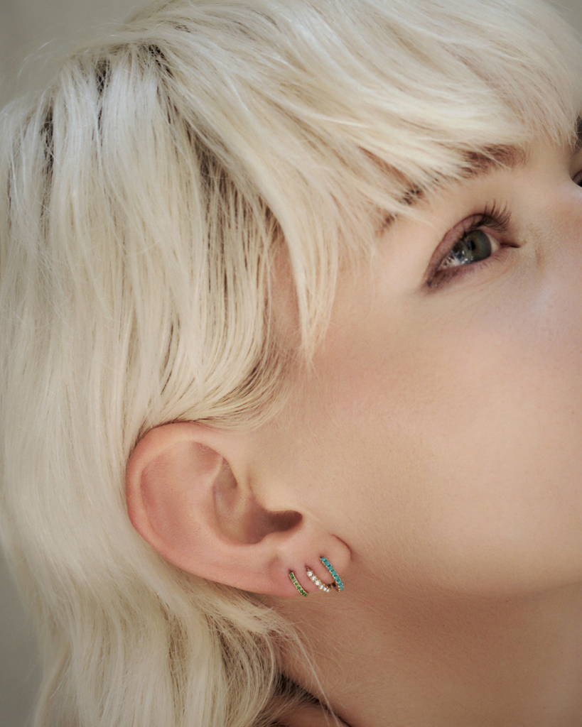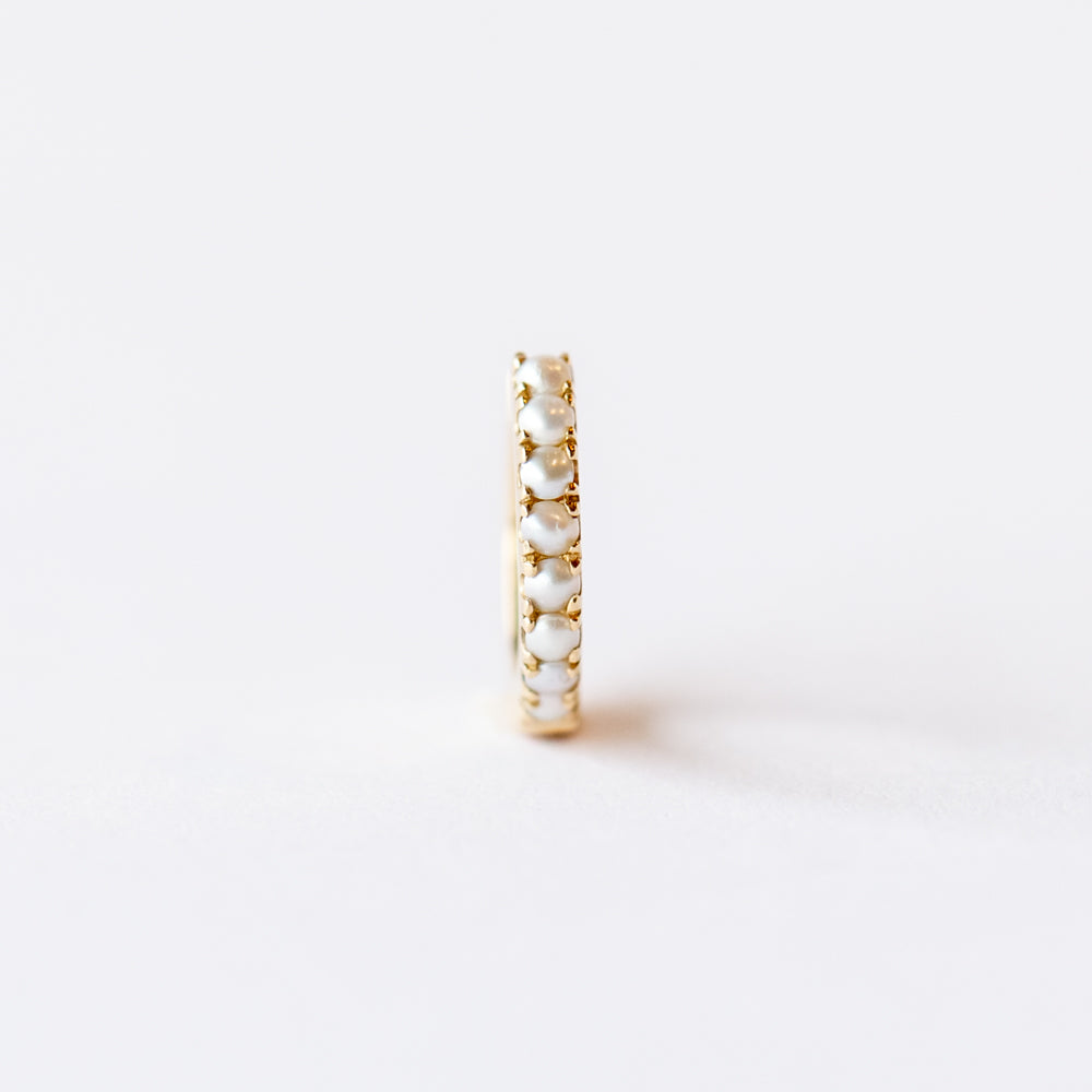 A gleaming string of petite freshwater pearls punctuates a gold huggie. The classic shape allows for extremely versatile placement on the helix and lobe.
